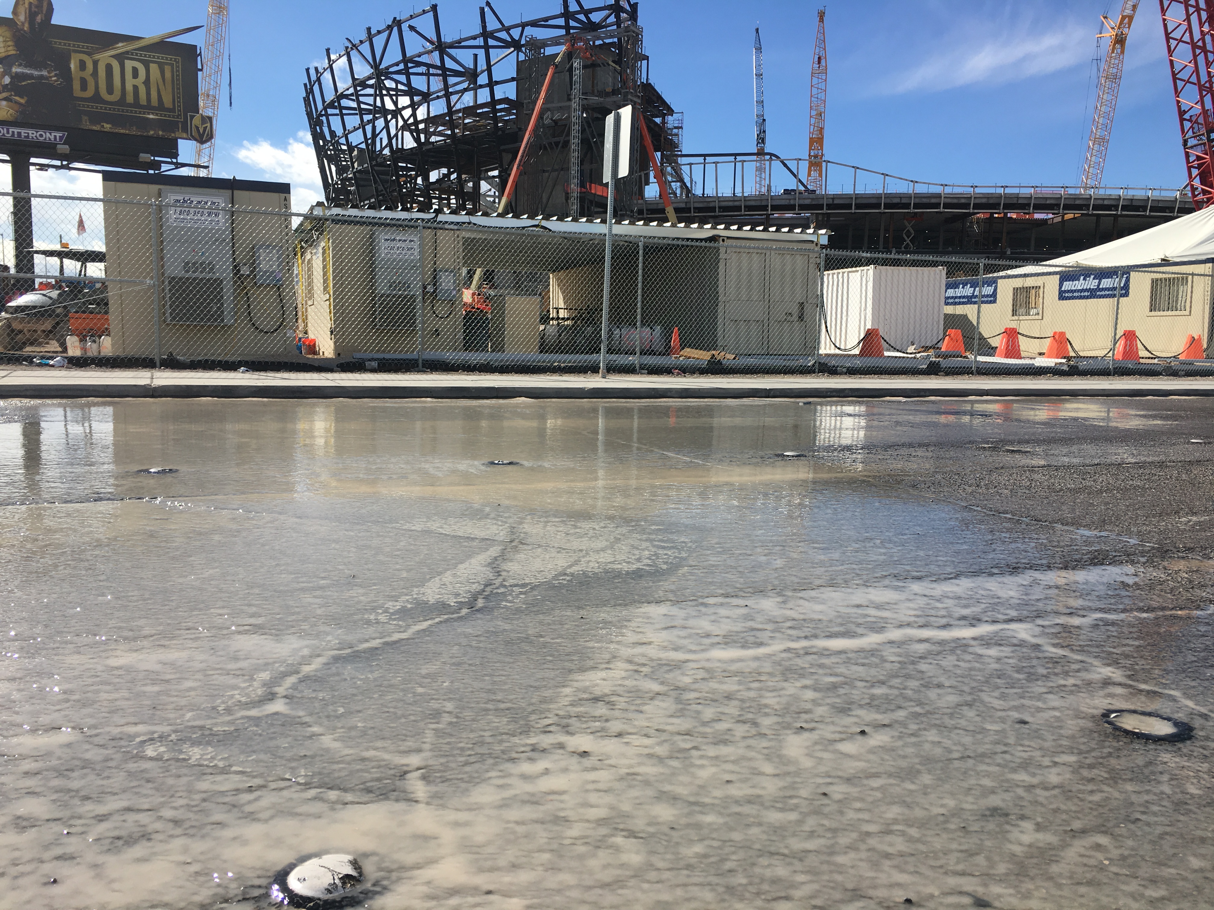 Construction workers were digging a trench in the road next to the new Raiders stadium for utilities, while other workers flushed water pipes Saturday morning.
