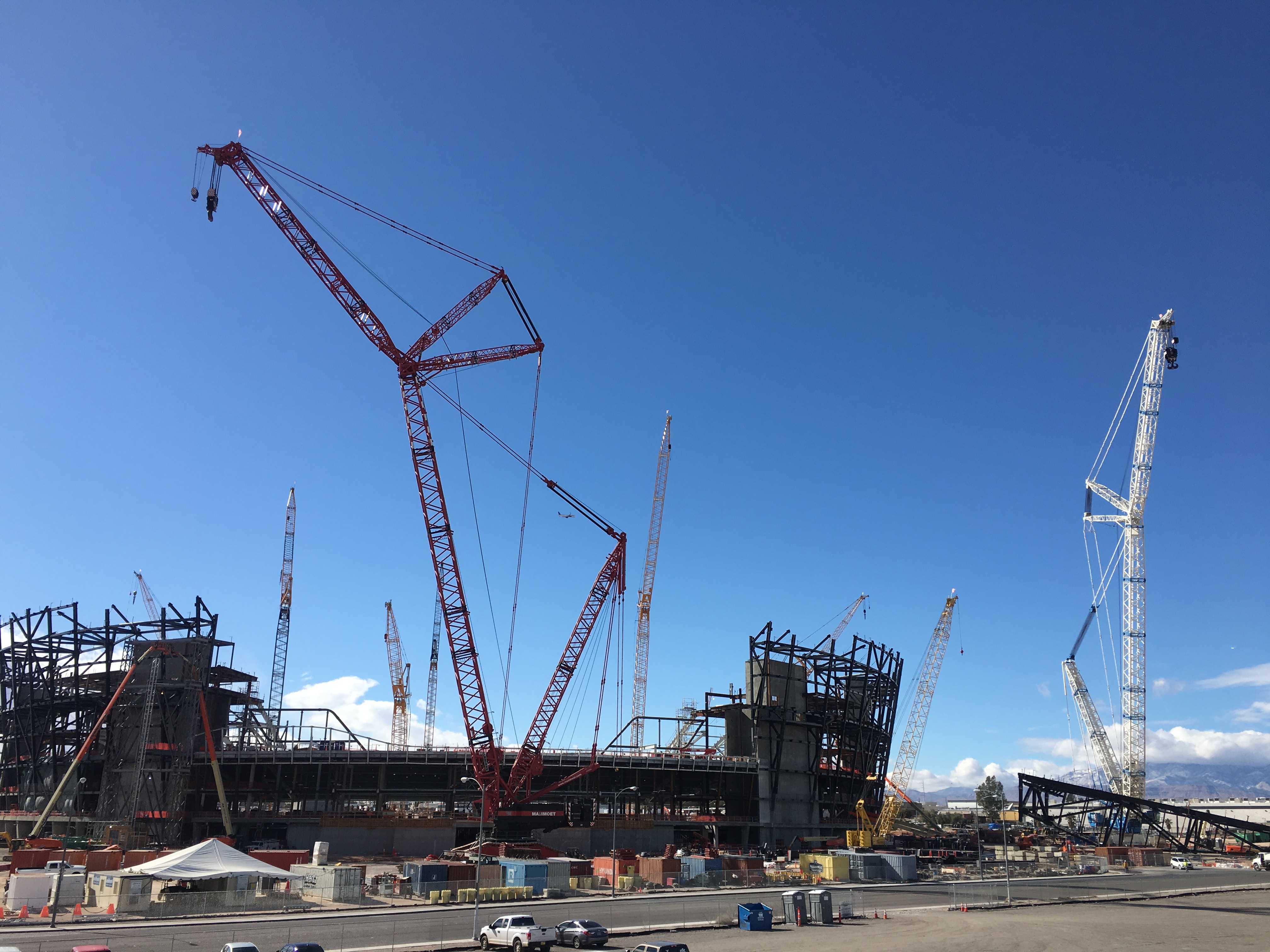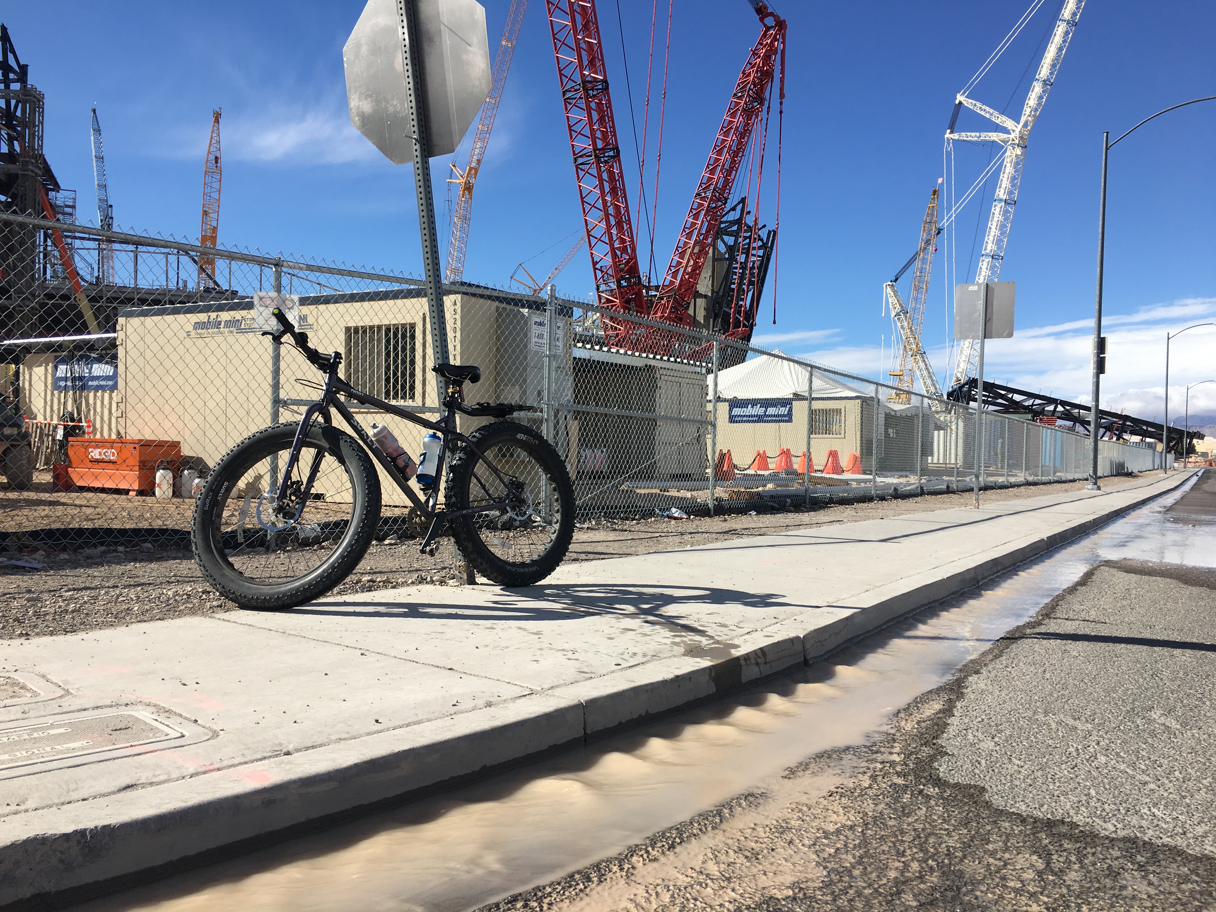 Come along for the bike ride to see all the scenes. First, it’s the the $1.8 billion Raiders stadium project (about $1.3 billion is being spent on the actual stadium itself.) It’s easy to chat with workers when you’re biking along the stadium site on Polaris Avenue and see the progress. Let’s take a look at the utility work, the water on the street from the pipe flushing and the cranes.
