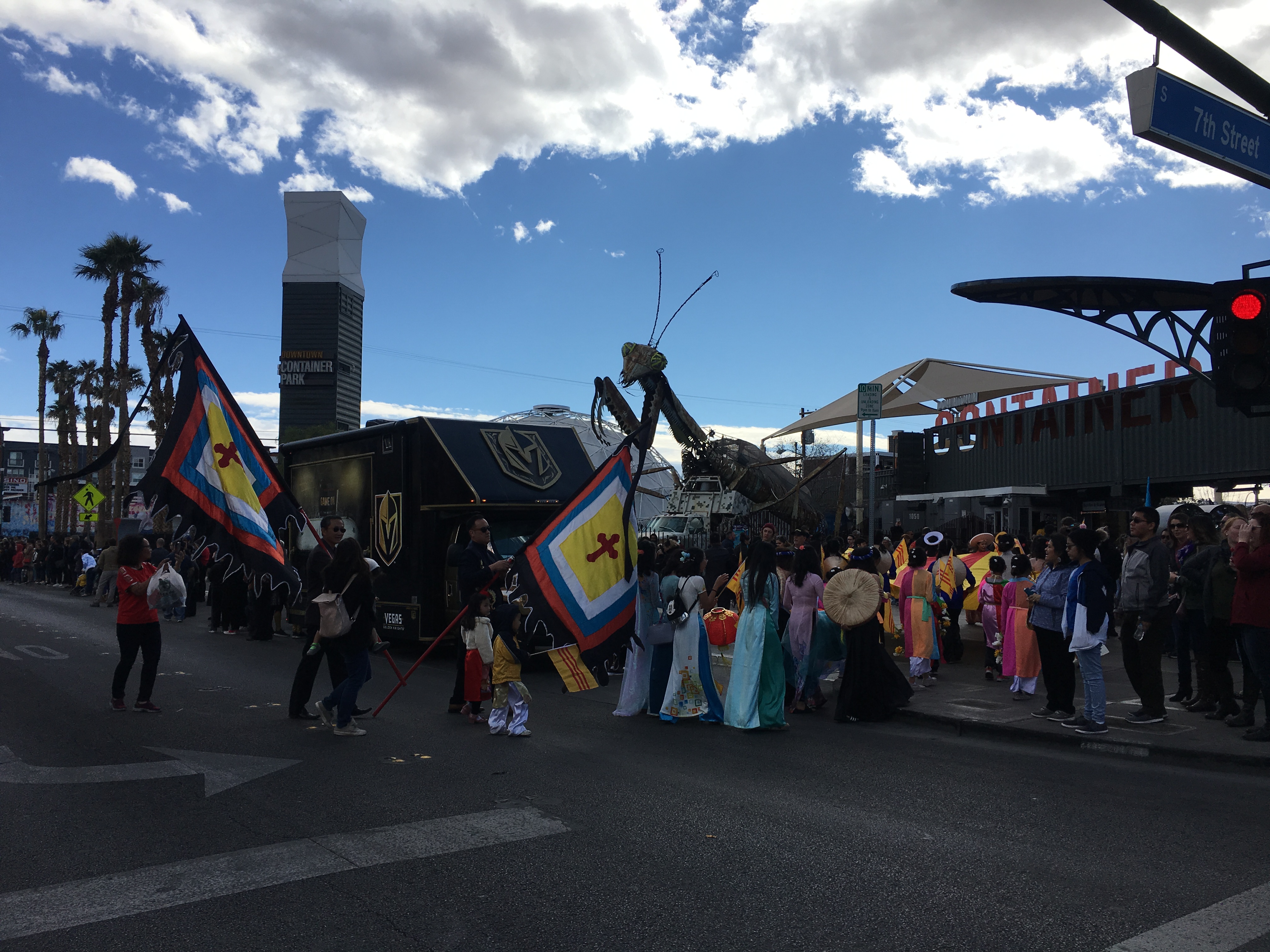 From T-Mobile Arena it was off to downtown Las Vegas, where I headed to Fremont Street and biked literally into the Chinese New Year parade, where the Vegas Golden Knights were a sponsor and their VGK event truck was in front of Container Park right along the parade route.