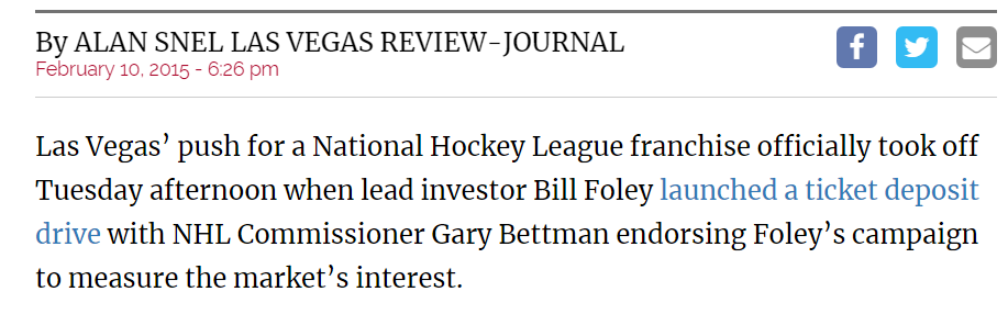 Sunday was the four-year anniversary of Gary Bettman’s visit to the MGM Grand hotel-casino to give the league’s blessing to a Las Vegas hockey ticket deposit campaign spearheaded by a property title insurance/restaurant development businessman by the name of Bill Foley and a bunch of sports-loving brothers known as the Maloofs who used to own the NBA Rockets and Kings.