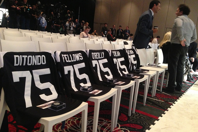 The early “Las Vegas Founding 75” hockey jerseys given to community leaders who paid beefy ticket deposits were draped over chairs at the Feb, 10, 2015 announcement.