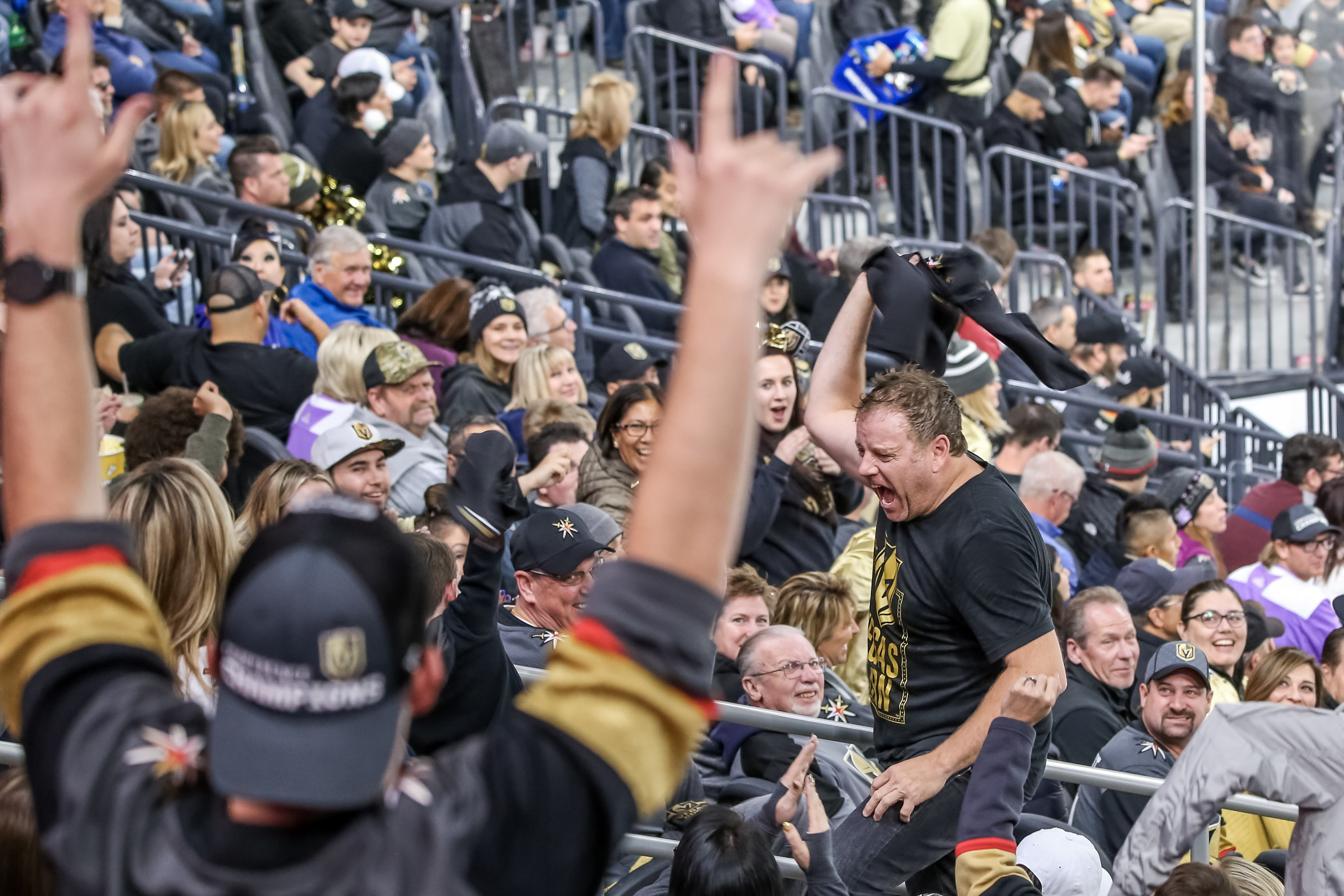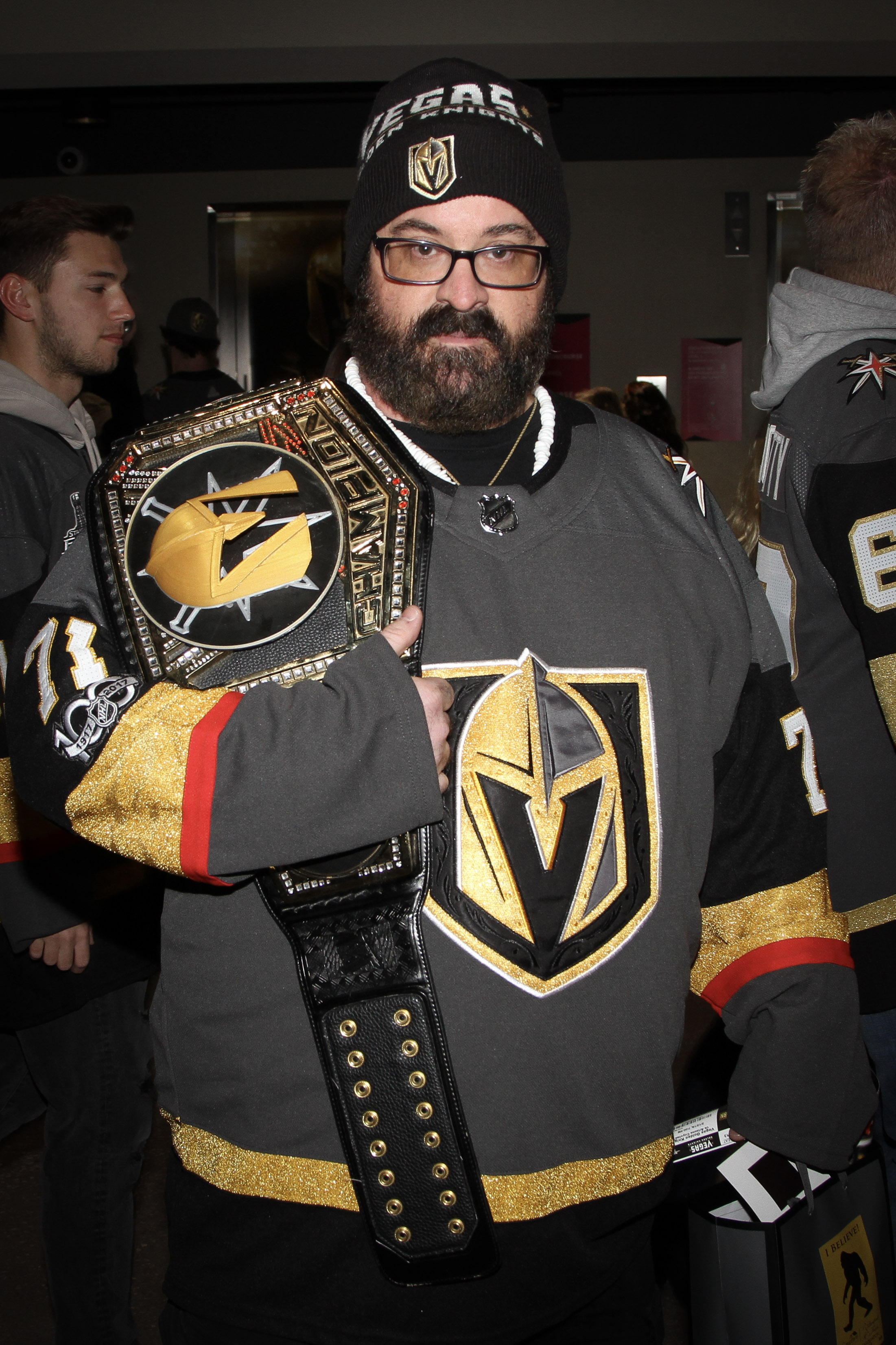 Here’s Matthew James Smiejan, Jr., with his trusty Golden Knights belt — which makes him a popular guy with the VGK fan selfie seekers.