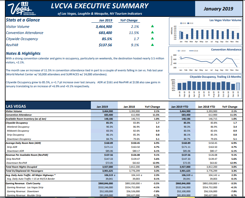 Las Vegas Convention and Visitors Authority (LVCVA) stats for January show visitorship is up slightly from Jan, 2019 to Jan, 2018.