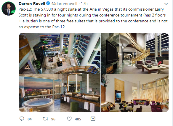It looks like Pac-12 Commissioner Larry Scott has some extra room during his stay in Las Vegas for the Pac-12 basketball tournament. My pal Darren Rovell with Scott’s accommodations courtesy of the Aria.
