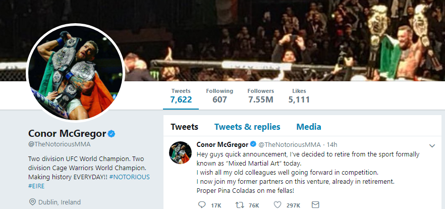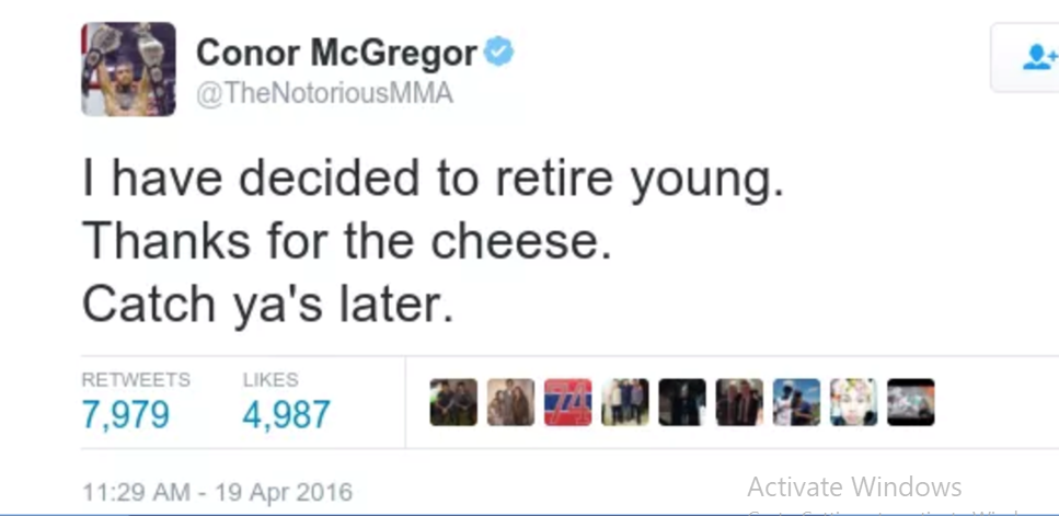 UFC's Conor McGregor said he's retiring, according to his recent tweet. But I guess not.