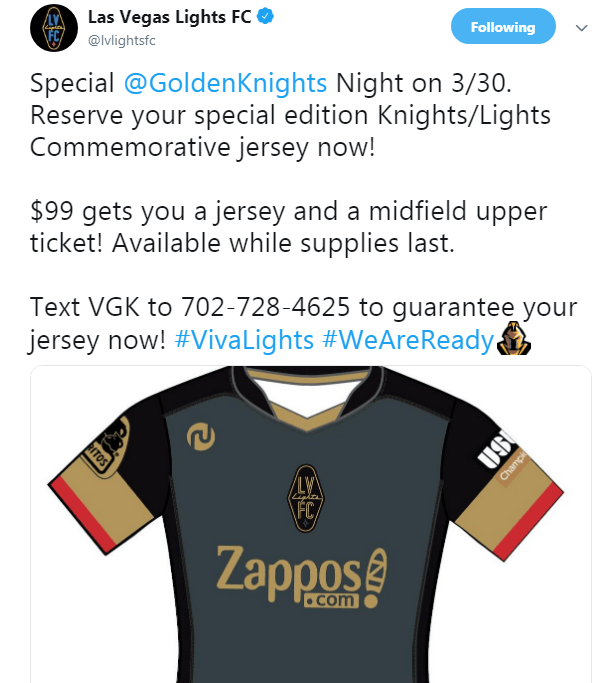 In an attempt to draw new fans who have not been to Lights games, the downtown-based soccer team is trying to use the appeal of the Golden Knights to get hockey fans hooked on Las Vegas soccer by offering a VGK-theme soccer jersey and Saturday game ticket for $99. The Lights soccer jersey in the Knights colors is also available for $50 to Lights season ticket holders.
