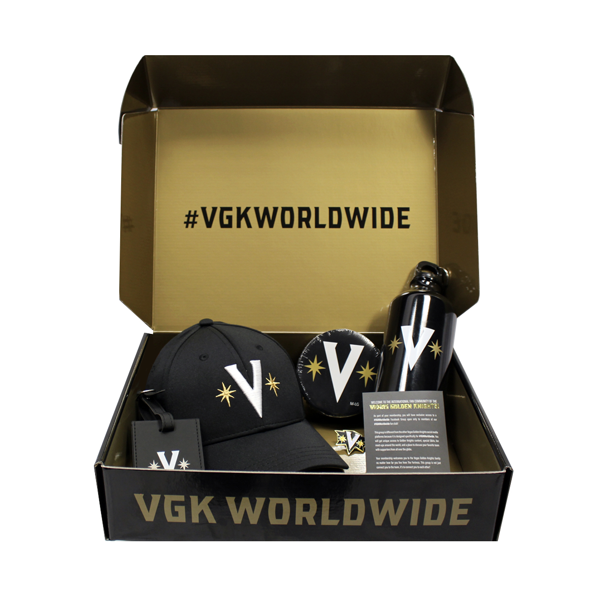 Here’s what you get for $120: A custom kit in the mail with “specialty premium items” showcasing a brand-new logo and exclusive access to a #VGKWorldwide Facebook Group open only to members. Inside the box, fans will receive a VGK-branded logo goodies — a hat, flag, T-shirt, luggage tag, aluminum water bottle, poker chip, playing cards and lapel pin.
