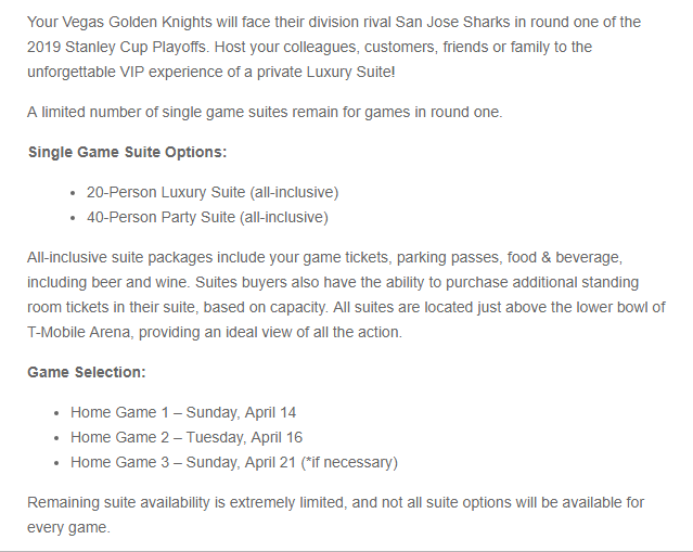 Not only was there plenty of open seats to watch the VGK practice, the team has not sold out its T-Mobile Arena suites for Sunday Game 3 and Tuesday Game 4 home contests. So, the Golden Knights sent out an email telling fans that “a limited number of single game suites remain in round one.” There were available suites for both 20 people and 40 people. The Golden Knights did not say how much a suite for a playoff game costs, but it’s obviously in the thousands of dollars. Not all season suite holders renewed deals for the postseason, which opened up the single game suite options. Here’s what the email said: