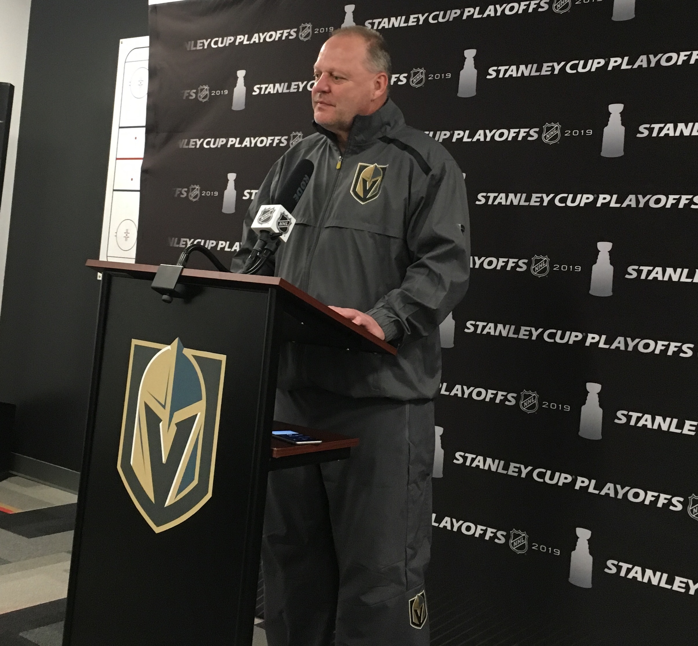 That’s why it was interesting to see the bleachers at VGK practices at the team’s Summerlin headquarters not filled to capacity both Monday and Tuesday as the Golden Knights prepare to play the San Jose Sharks in the Stanley Cup playoffs’ Round 1 in San Jose Wednesday. Today Golden Knights superfans Matt Helfst who is the VGK Flagman and T-Mobile Arena Jumbotron regular Christopher Green were among the few hundred fans who found time to watch the 11 a.m. practice. There was a line of fans outside the training center to send off the Golden Knights to San Jose around 1:15 p.m.