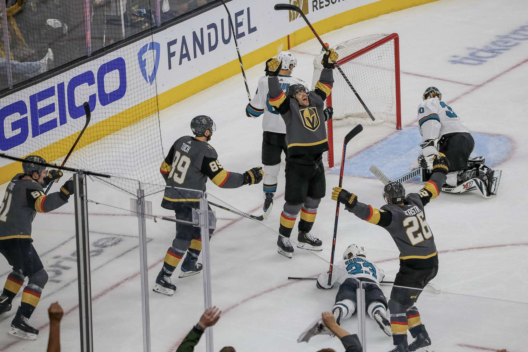 A massive crowd of 18,567 watched the team’s biggest star — Golden Knights goalie Marc-Andre Fleury — shut out the San Jose Sharks Tuesday and give the VGK a stranglehold on the first round series with a 3-1 games lead. The Knights can clinch the series in San Jose Thursday.