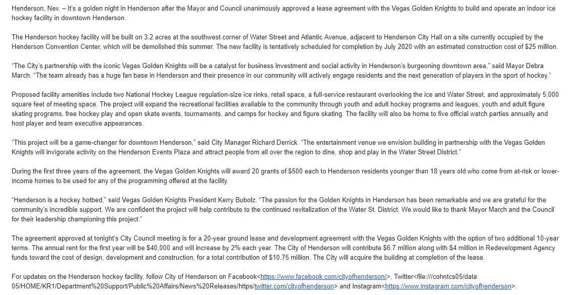 The council meeting NB 61 agenda item includes the city of Henderson kicking in $10.75 million to the Golden Knights for the two-rink community ice center that the city believes will be a good economic investment and an amenity for Henderson residents. Here’s the resolution calling for the public contribution of dollars for the NHL team.