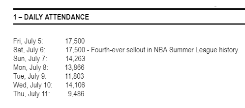 This year’s Summer League started with two sellouts. Last year’s Summer League also started strong in attendance and finished at 139,972. Here’s a look at the 2018 attendance numbers: