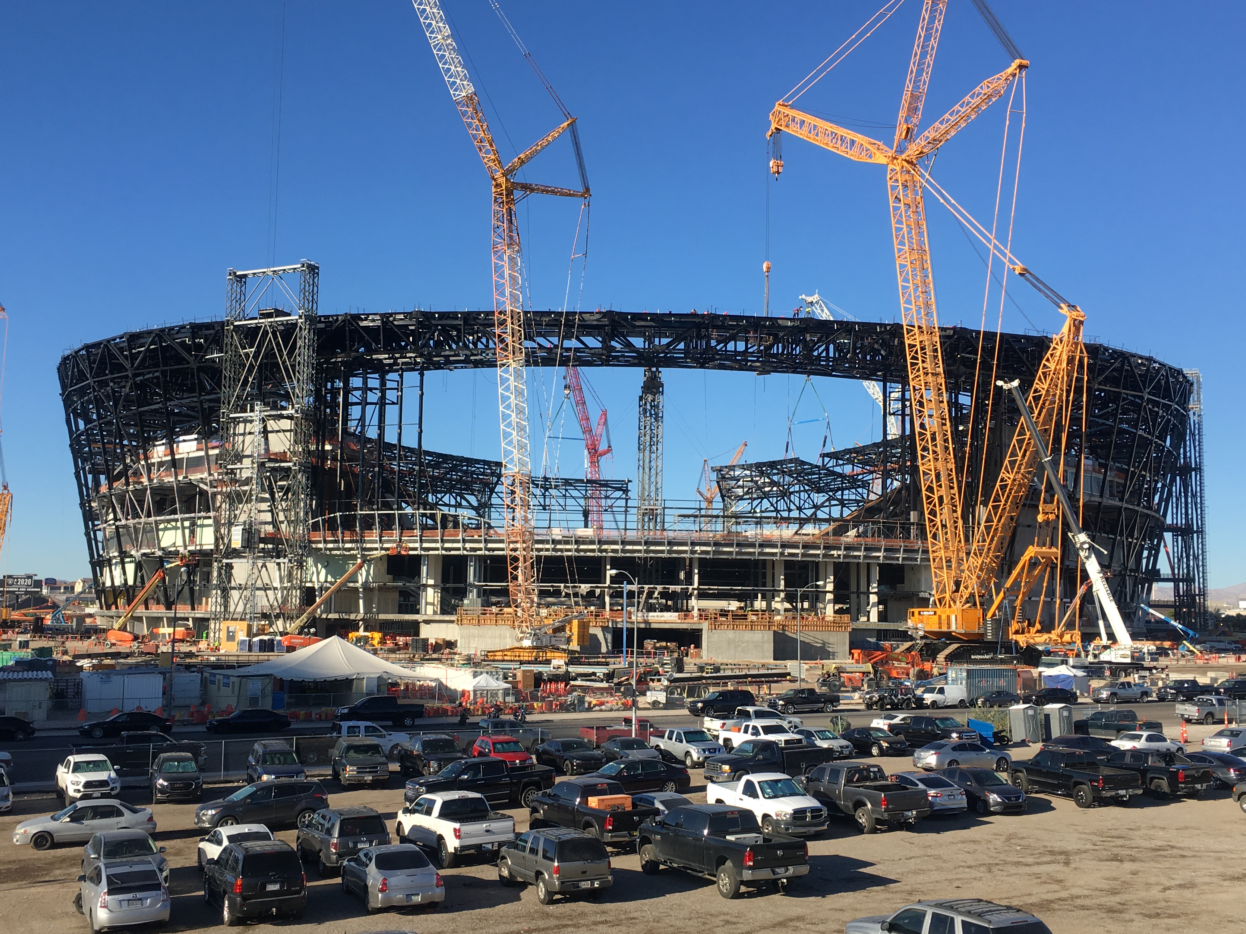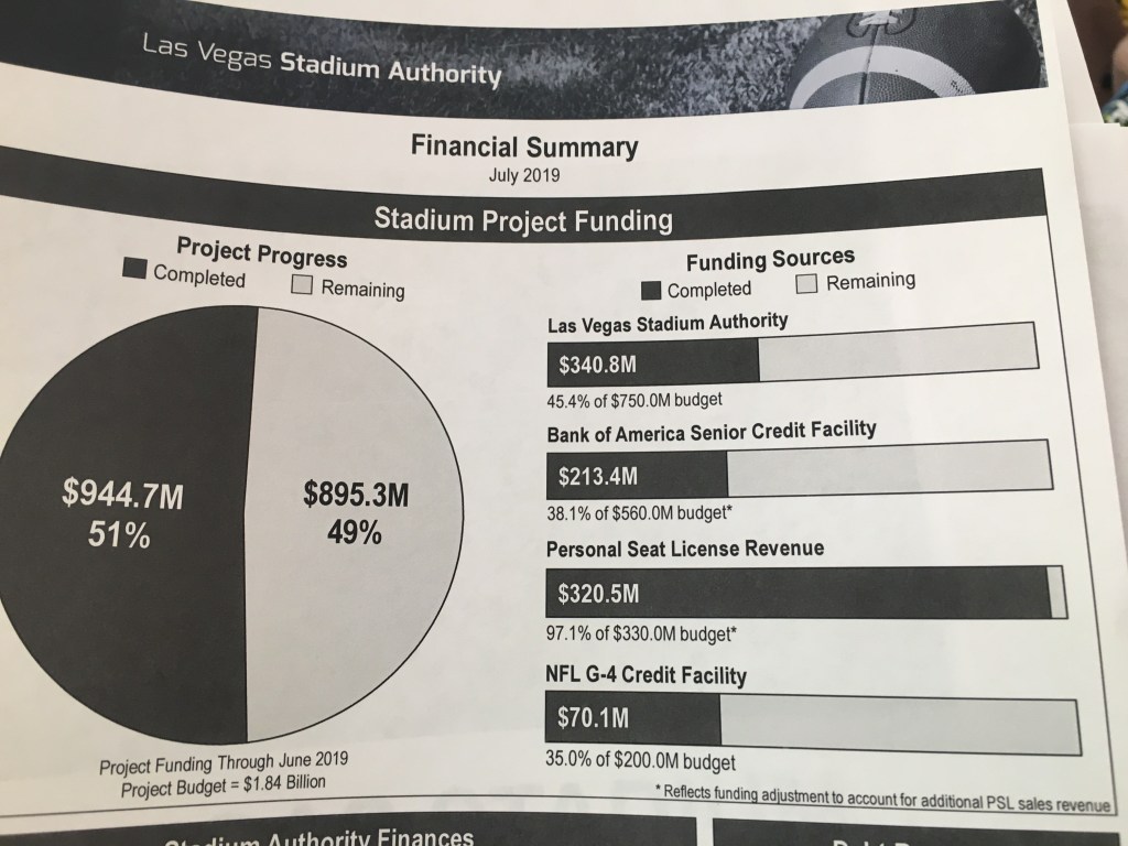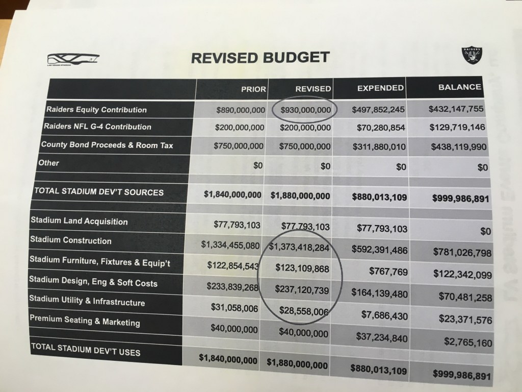 While many people refer to the Raiders stadium as costing $1.8 billion or $1.9 billion, the stadium’s construction is actually $1.37 billion. The overall stadium project, which includes the construction and soft costs like professional design work, land acquisitions and another $40 million in premium seating additions, adds up to a $1.88 billion overall stadium project cost. Take a look here: