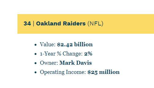 Forbes said the Raiders is one of 26 NFL teams that made Forbes’ 50 most valuable teams. But of the operating incomes of the 26 NFL teams on the Forbes list, the Raiders’ $25 million was the lowest by far. In comparison, the Dallas Cowboys, the world’s top valued sports team at $5 billion, has an operating income of $365 million, according to Forbes. The NFL team on the Forbes list with operating income closest to the Raiders is the Miami Dolphins, which has $56 million in operating income.