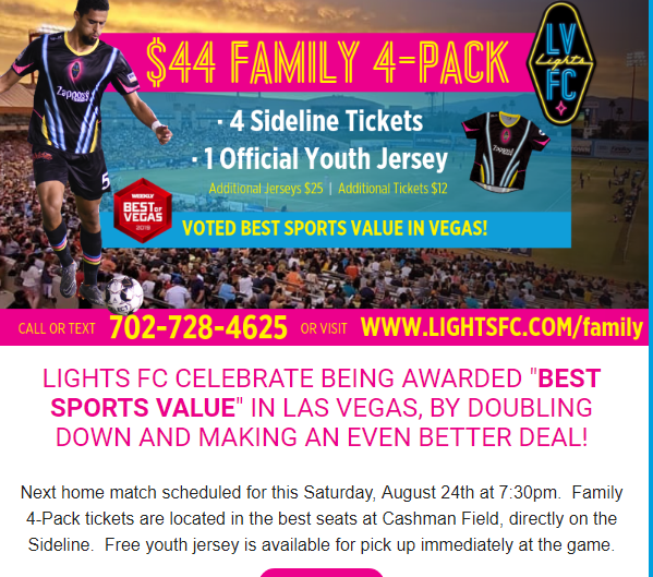 Joining UNLV with the affordable ticket approach is the Las Vegas Lights, which has been crowing this week about a $44 four-pack of tickets for Saturday’s home game at Cashman Field. The deal works out to 11 bucks a ticket and the soccer team even throws in a youth’s Lights jersey into the mix.