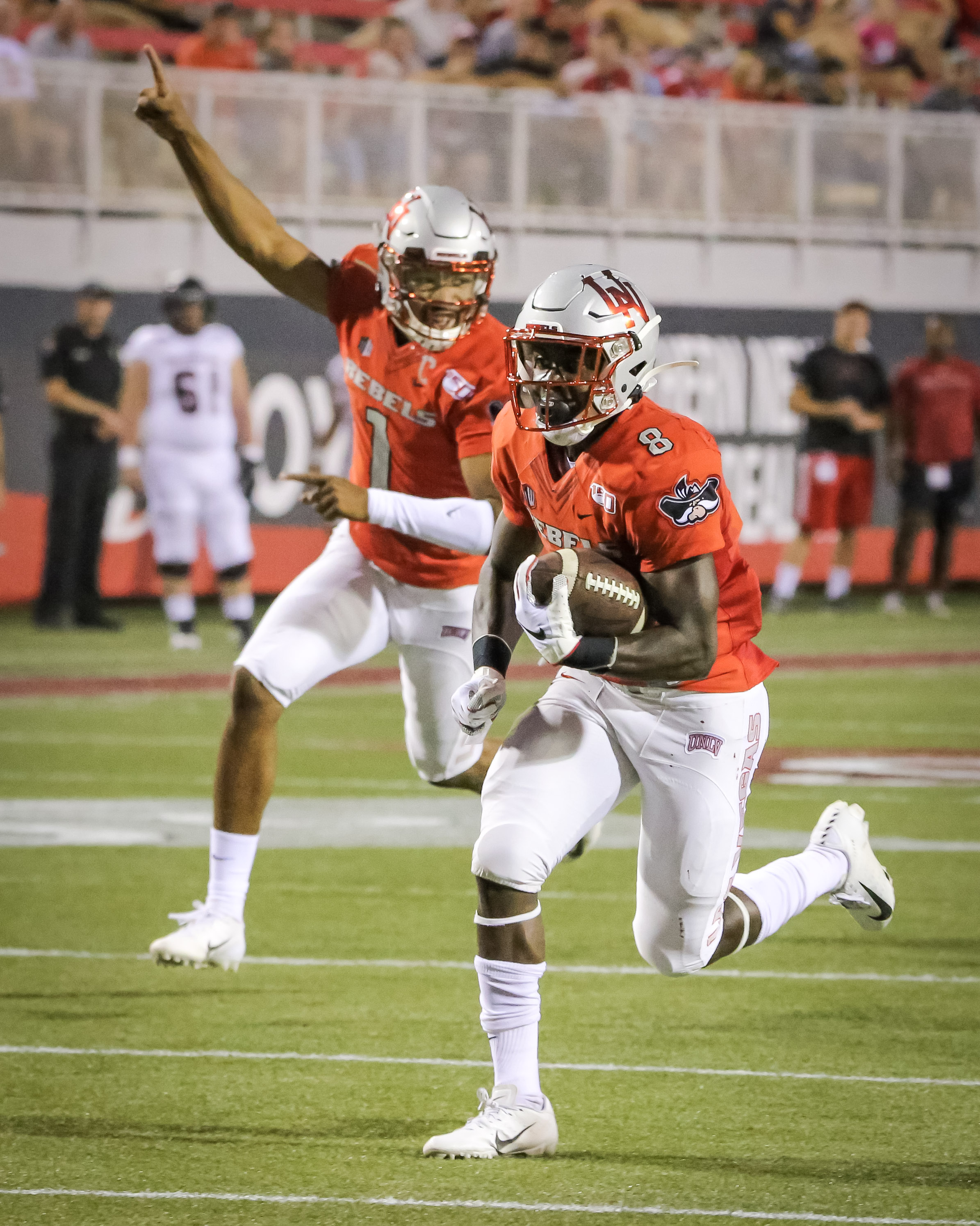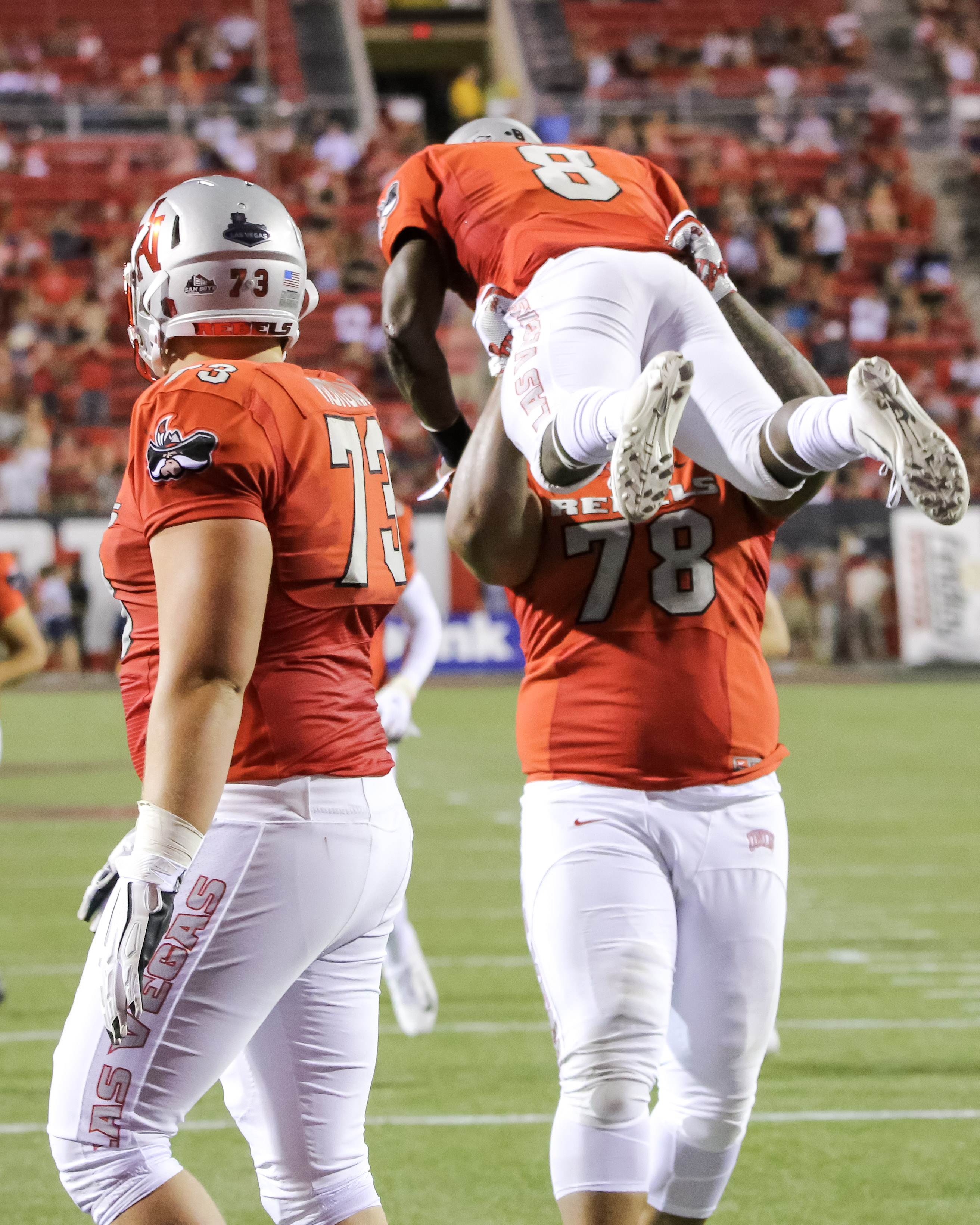 Players and fans celebrated a big win over Southern Utah as the Rebels pounded the Thunderbirds, 56-23, before announced attendance of 17,421 for the 2019 season-opener.