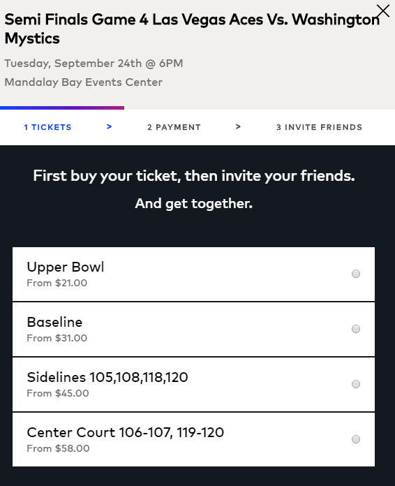 The Las Vegas Aces, fresh off a Game 3 win over the Washington Mystics to stay alive in the WNBA Semifinals Sunday, are contacting fans with Game 4 ticket prices that start at $21 for upper bowl seats at Mandalay Bay Events Center.