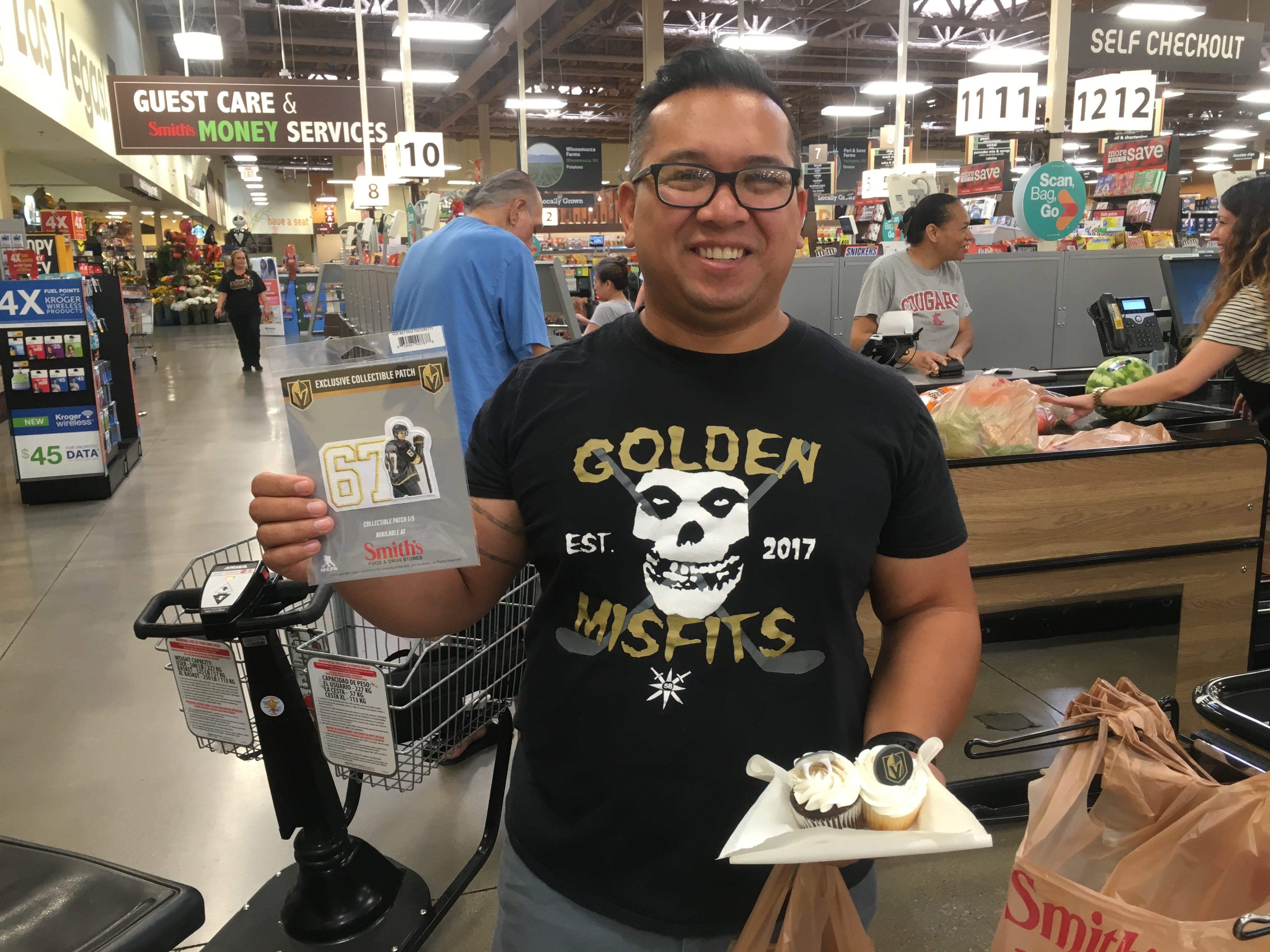 Smith’s had a big cake in the shape of an ice rink with Chance sitting in the middle plus lots of cupcakes to dole out as several dozen Golden Knights fans dressed in jerseys and T-shirts gobbled up the first of five patches that are being sold for 10 bucks each. Naturally, the patch for Max Pacioretty, known as “Patches,” was the first to be sold.