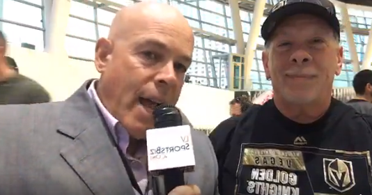 The very first VGK fan on line to get into the Big Ice House by the Strip is this fella Steve, who shows up at 4:15 p.m. before home games where the doors open about 5:45 p.m. That means Steve waits an hour and a half for the doors to open. He doesn’t mind it. He chats with fellow fans until his wife shows up via Uber. Here’s his story: