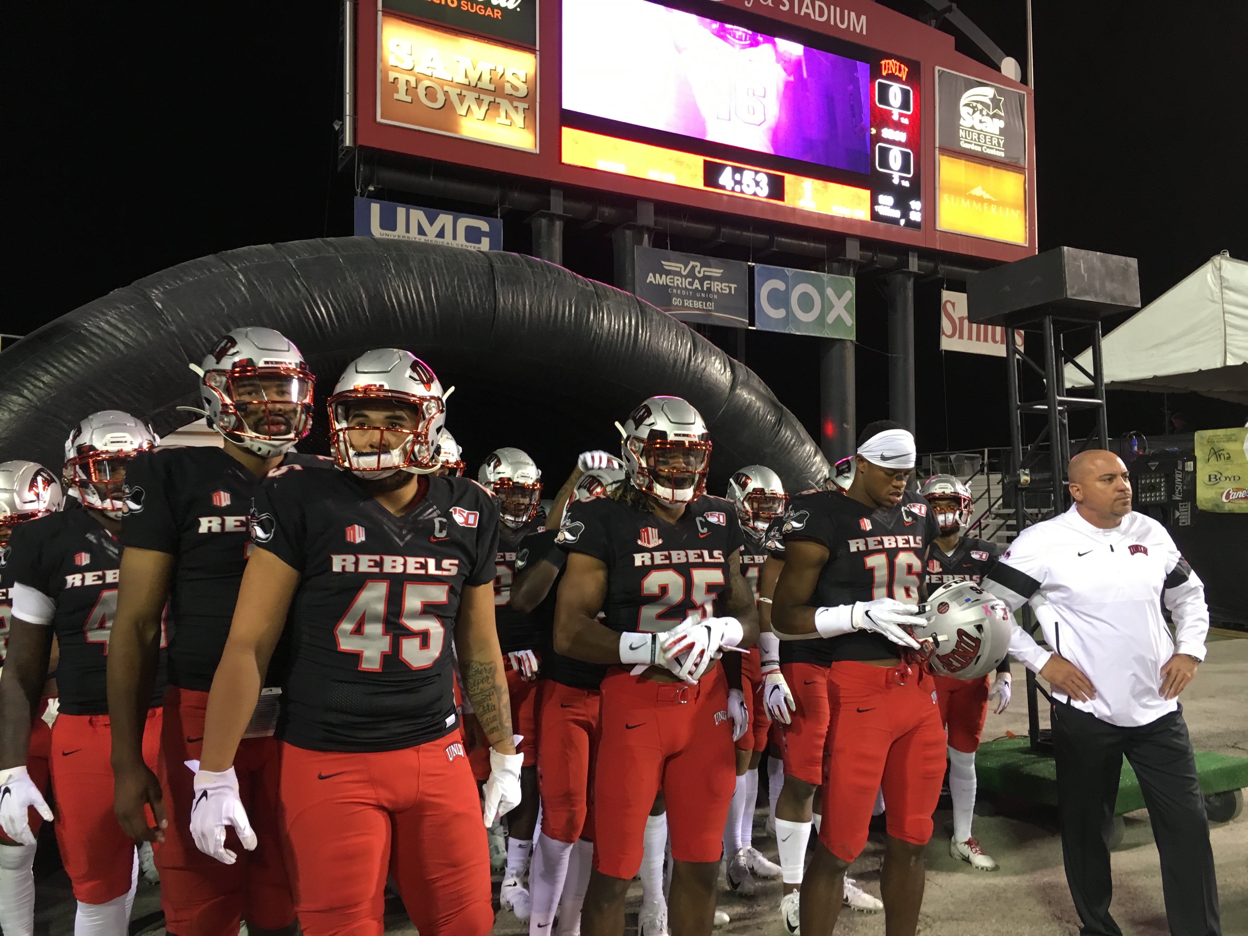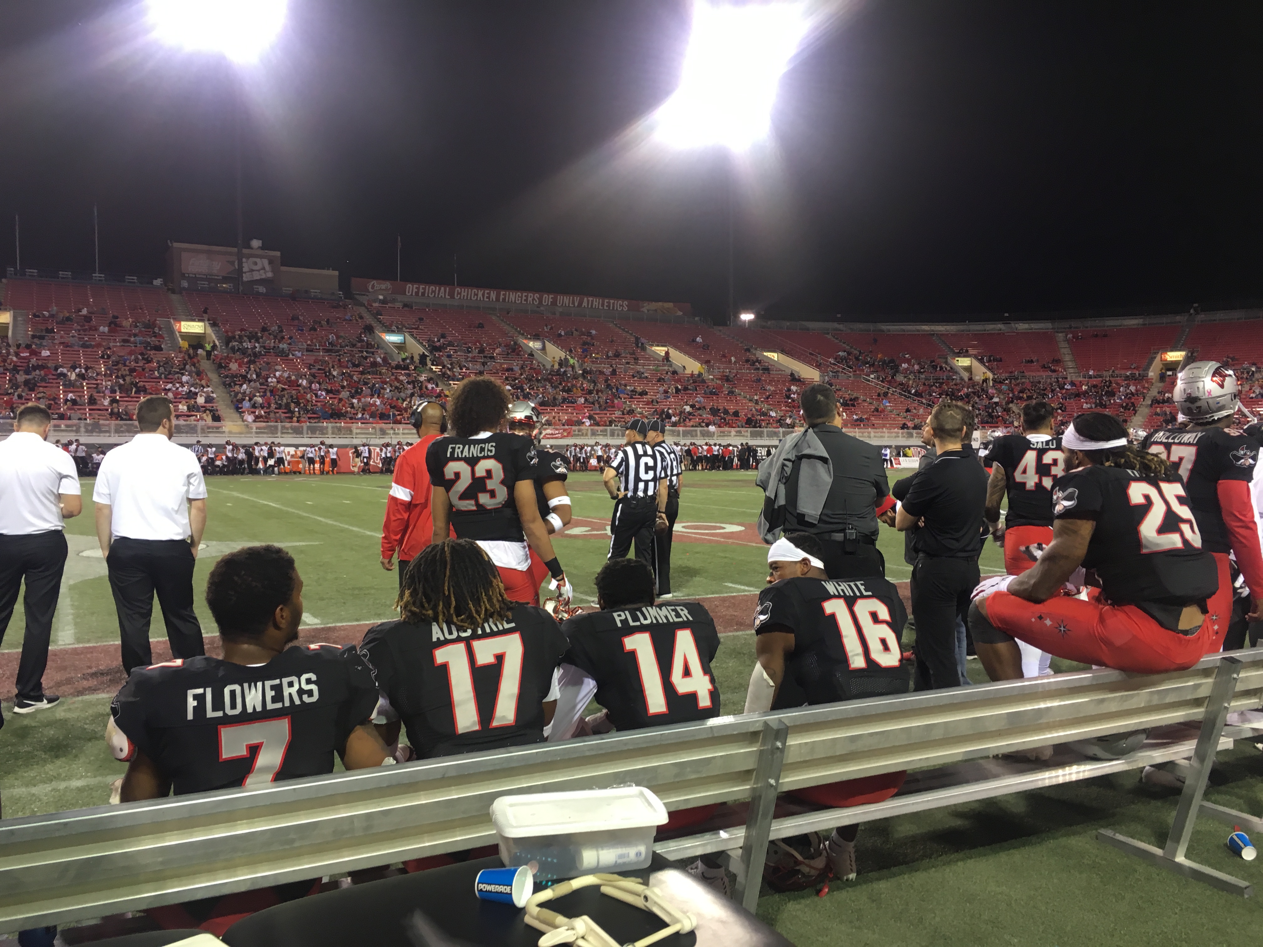 I strolled the sidelines at tonight’s UNLV football game and you can’t help but notice the earnestness of it all — Athletic Director Desiree Reed-Francois in her bright red pants with a bright smile chatting with guests; Learfield sponsor chief Dan Dolby ready to recognize sponsors during breaks in the action; and even the security guys in reflector vests who cringe when the UNLV football team gets a punt blocked.