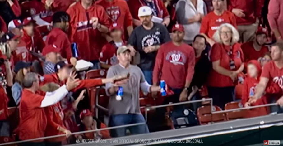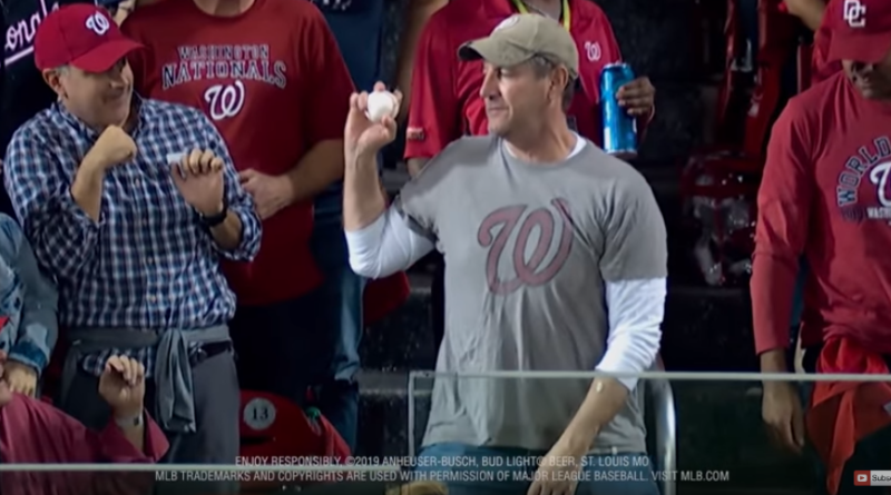 Tip of the sports marketing cap to Bud Light for creating a TV commercial spotlighting Bud Light drinker/Washington Nationals fan Jeff Adams who used his chest to acquire a home run baseball while keeping his cans of Bud Light firmly in both hands at Sunday’s World Series Game 5 in Washington, D.C.