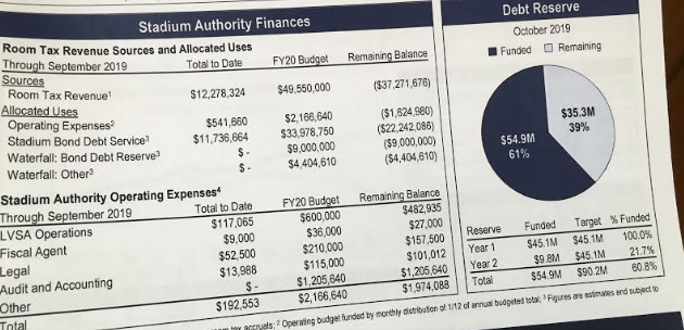 The room tax money that is being collected in Southern Nevada to pay the $750 million public subsidy to the Raiders is running very close to initial projections. From March 2017 through Sept. 2019, $127,504,230 was collected in hotel room tax revenue — about $300,000 from the budgeted $127,834,347 for the same time period.