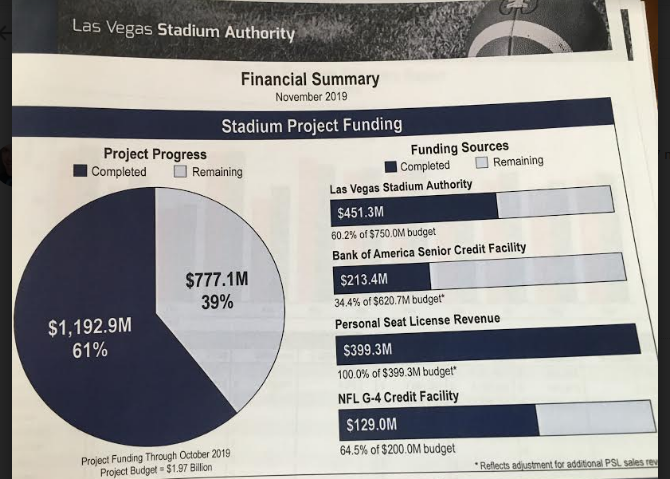 The Raiders’ point man on the stadium — Don Webb — played a video for the board and audience showing a time lapse of the stadium construction to the sound track of John Wick’s music that is also used to introduce the Vegas Golden Knights players before games at T-Mobile Arena.