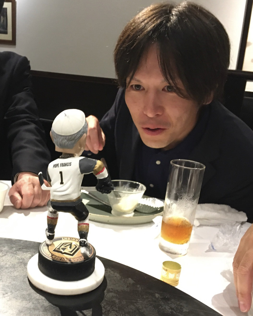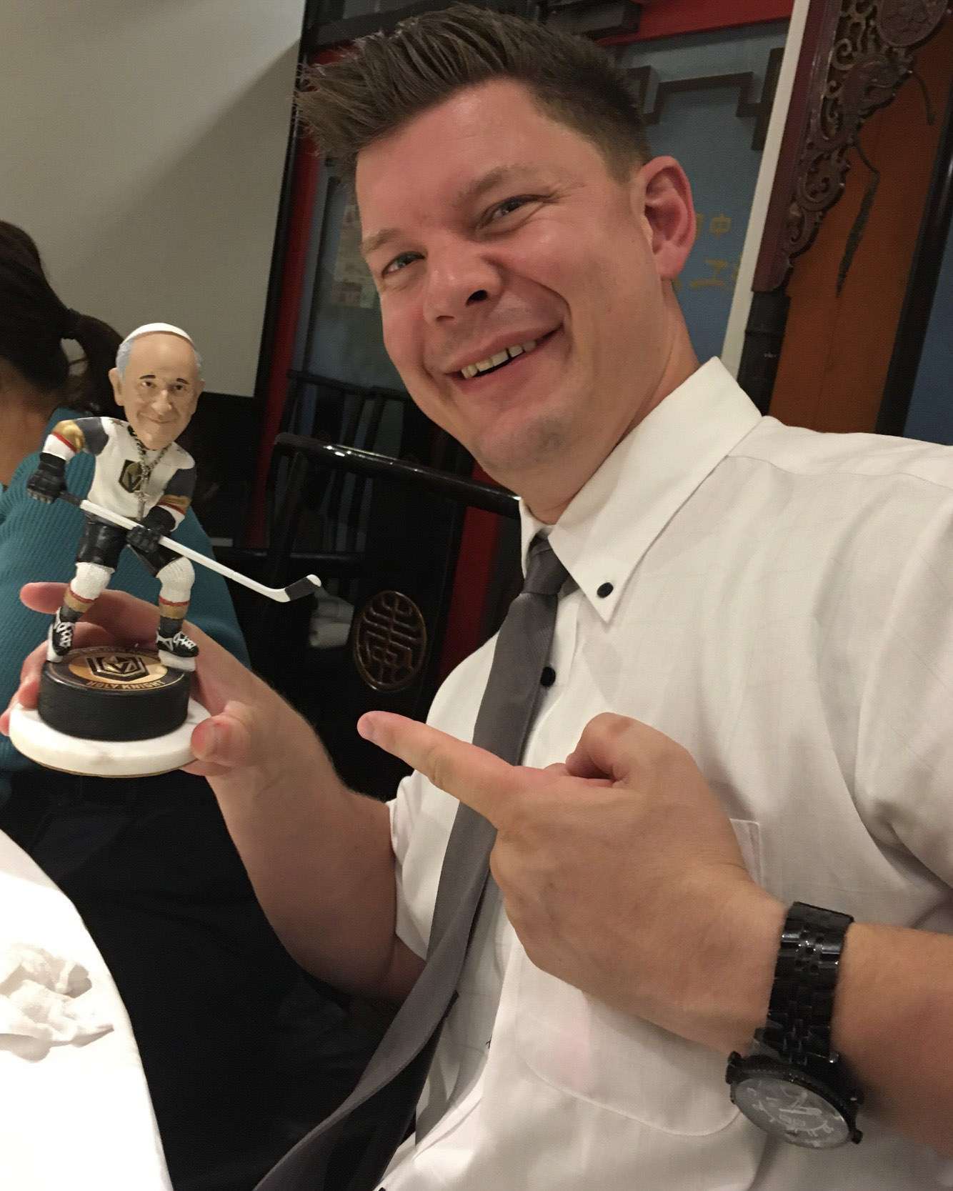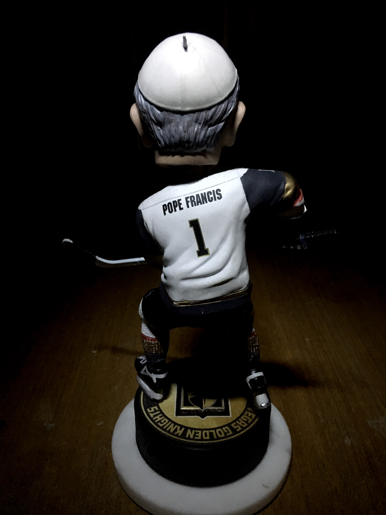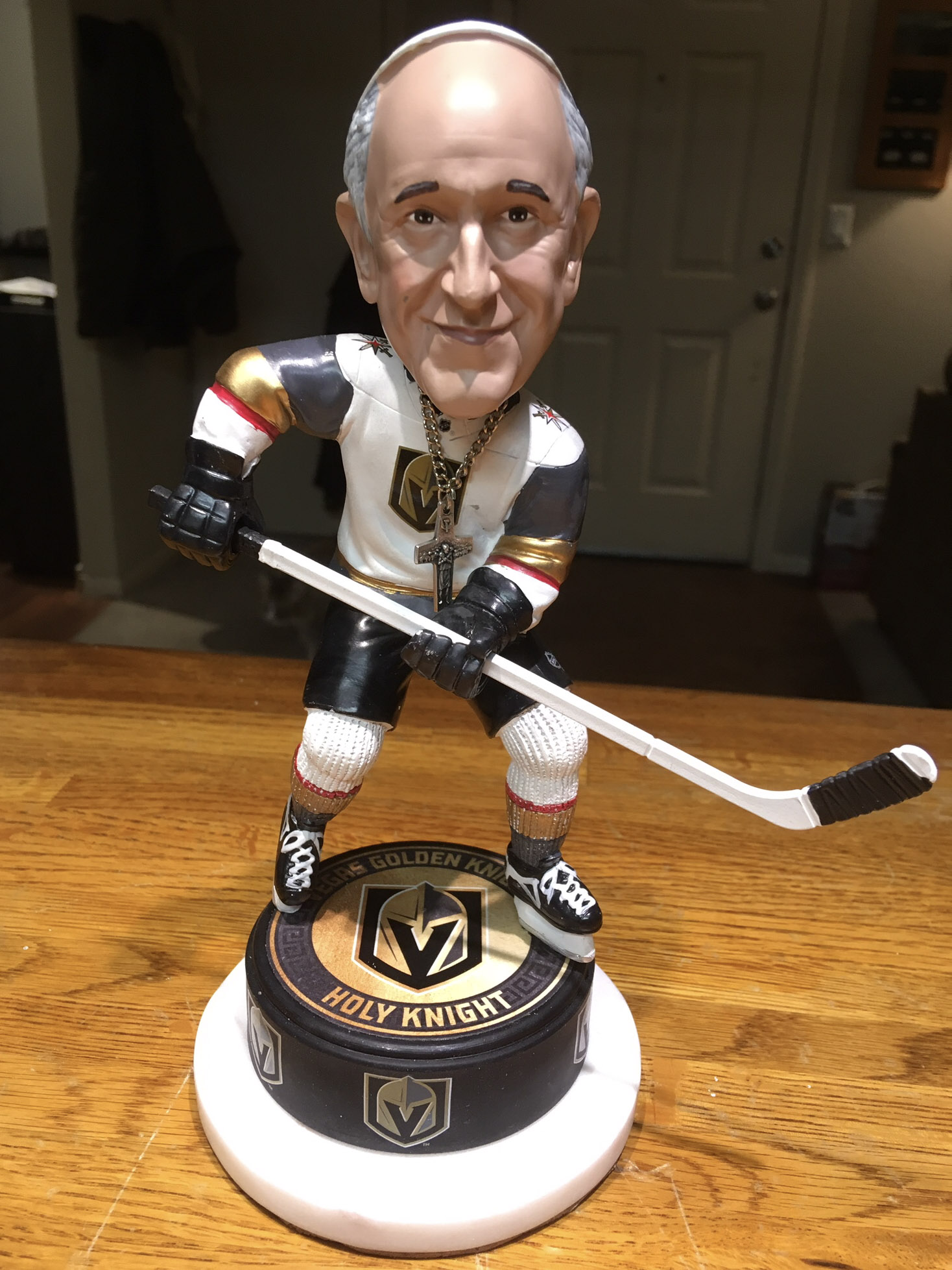 It was far from a solemn session with the Pope. O’Donnell also presented Pope Francis through a Vatican aide a “papalhead” with a not-so-subtle Vegas Golden Knights touch.