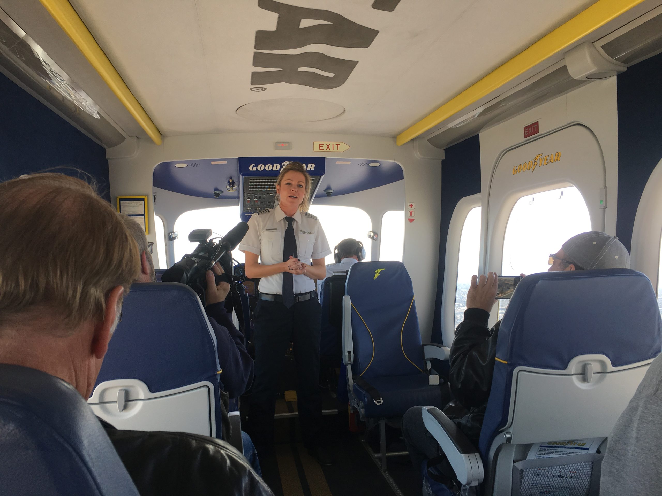 The 246-foot long Goodyear blimp named Wingfoot Three is zipping along nicely at a 35 mph c;lip and I’m along a half-dozen journalists soaking up the joy ride’s aerial views.