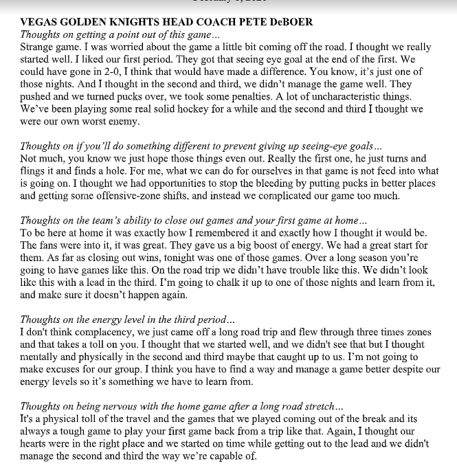 DeBoer, in his first home game as VGK coach after taking over for fired coach Gerard Gallant last month, used some of the same terms that Gallant used in describing why the Golden Knights failed to close out wins in the third period.