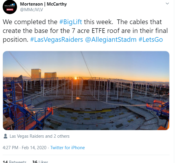 Mortsenson/McCarthy, the two building contractors teaming up on the $1.97 billion raiders stadium project, posted on Twitter that the cables that create the base for the translucent roof are in position.