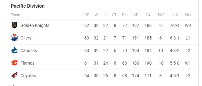 The Knights improved to 32-22-8 and have 72 points in the ultra-tight Pacific Division.