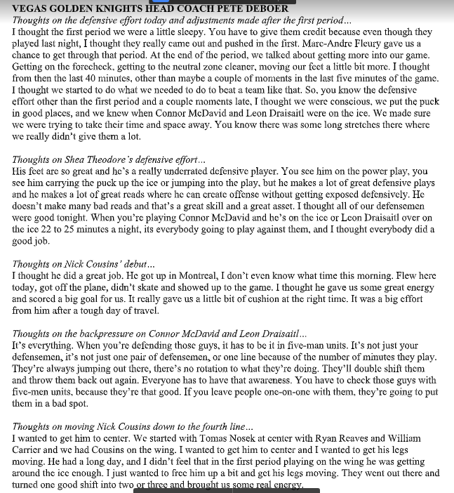 The Vegas scoring included a goal by newcomer Nick Cousins cleaning up a rebound to make the score, 2-0, in period three. VGK coach Pete DeBoer said Cousins’ had a long day of travel and didn’t skate until he reached T-Mobile Arena. Here’s DeBoer’s post-game comments: