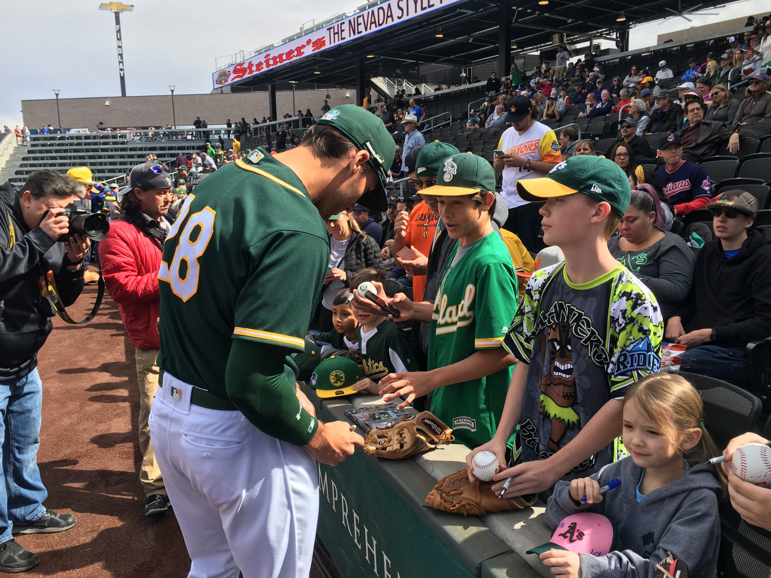 There’s baseball romanticism flowing at spring training games, so much so that grown men don baseball jerseys bearing the names of Hall-of-Famers like this fella wearing a number nine Reggie Jackson Oakland A’s jersey.