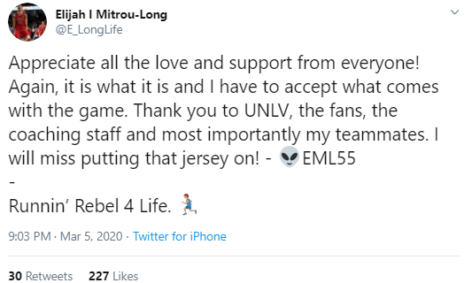 UNLV’s small-ball style was handicapped by the loss of guard Elijah Mitrou-Long, who was injured in the final game of the regular season, a 92-69 win over San Jose State Saturday. He did not play Thursday. He posted this item on Twitter Thursday.