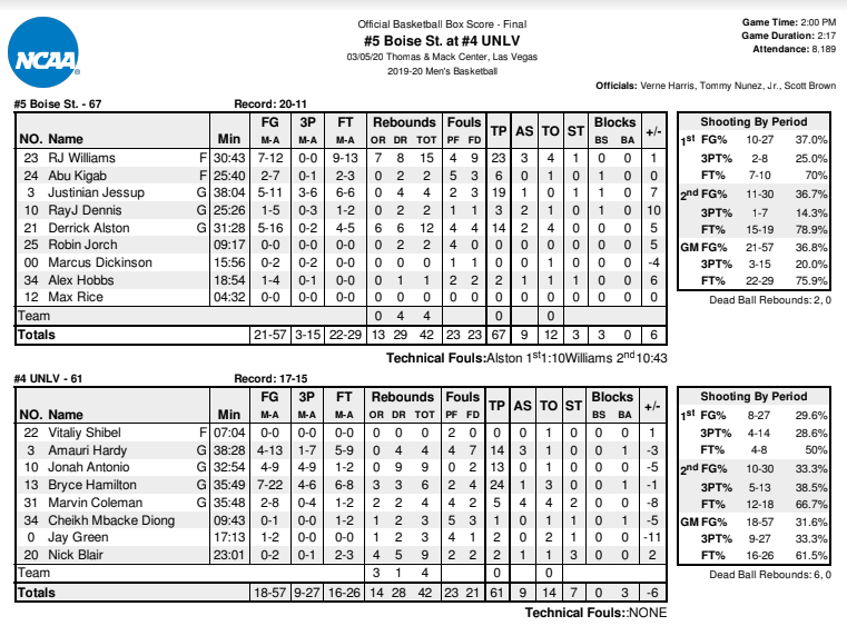 Then UNLV went on a five-game winning streak to end the season thanks to playing shorter players, including victories over the then number four-ranked San Diego State Aztecs and a 10-point triumph on Feb. 26 over the same Boise State team that knocked out the Rebs today.