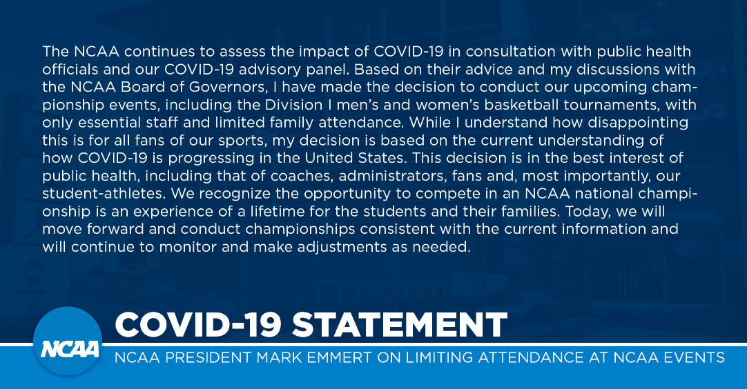 The NCAA will move forward with its national college basketball tournament, but will not allow fans to attend the games. Only staff and family members will attend. Here is the announcement: