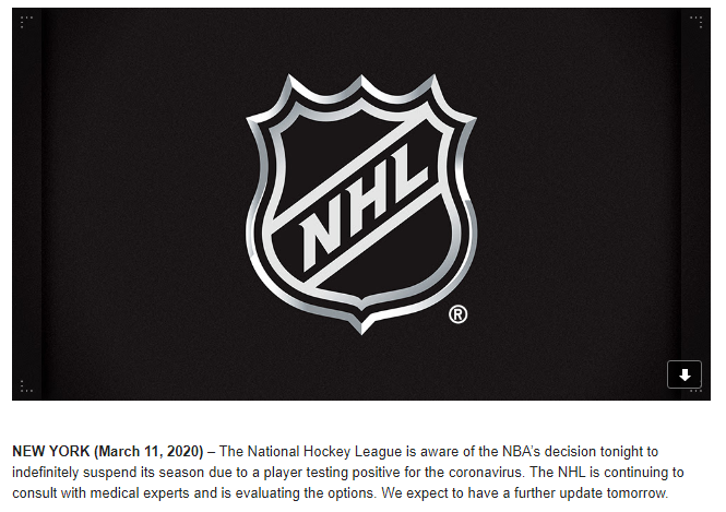 And the National Hockey League said it is aware of the NBA suspending its season and will monitor the virus crisis and issue more of an update Thursday.