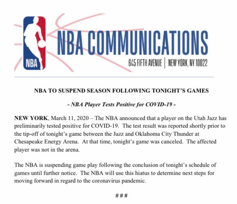 The NBA suspended its season after Utah Jazz player Rudy Gobert reportedly tested positive for coronavirus.
