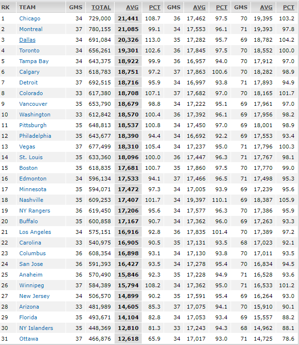 Through those 37 games, VGK averaged 18,310 fans per game – which was 13th out of 31 NHL teams. Chicago led the NHL in attendance at 21,441 fans a game through 34 home games, while Ottawa was last with 12,618 fans a game through 37 home games.