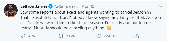 “Saw some reports about execs and agents wanting to cancel season??? That’s absolutely not true. Nobody I know saying anything like that. As soon as it’s safe we would like to finish our season. I’m ready and our team is ready. Nobody should be canceling anything.”