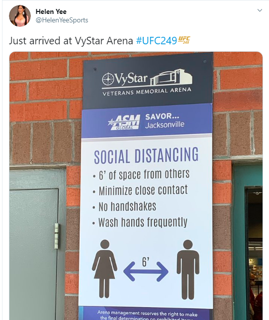 The hunger of UFC and MMA fans to consume live Octagon action was realized by a blockbuster match-up of Tony Ferguson and Juston Gaethje at an arena in Jacksonville, where Florida state athletic officials, the mayor and the arena welcomed White with open arms. If you have ever visited Jacksonville, you know the city is more Deep-South Georgia than multi-region Florida, which includes South Florida and Orlando. In other words, if White had to find a state and a city happy to accommodate UFC’s traveling fight show spectacle, he found it at VyStar Veterans Memorial Arena. MMA reporter Helen Yee posted this on Twitter: