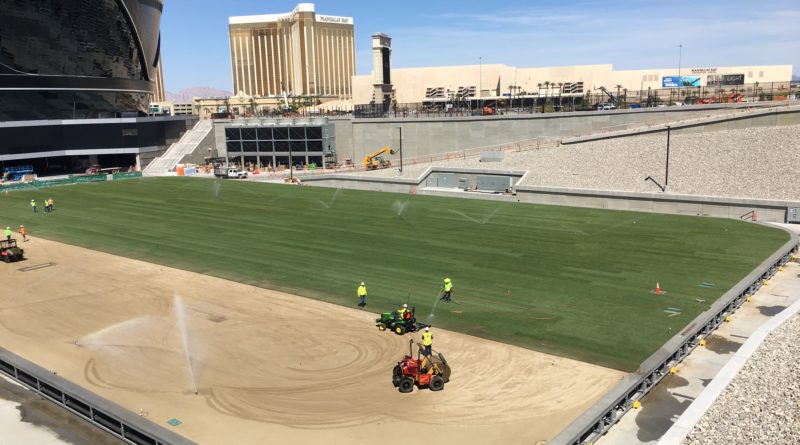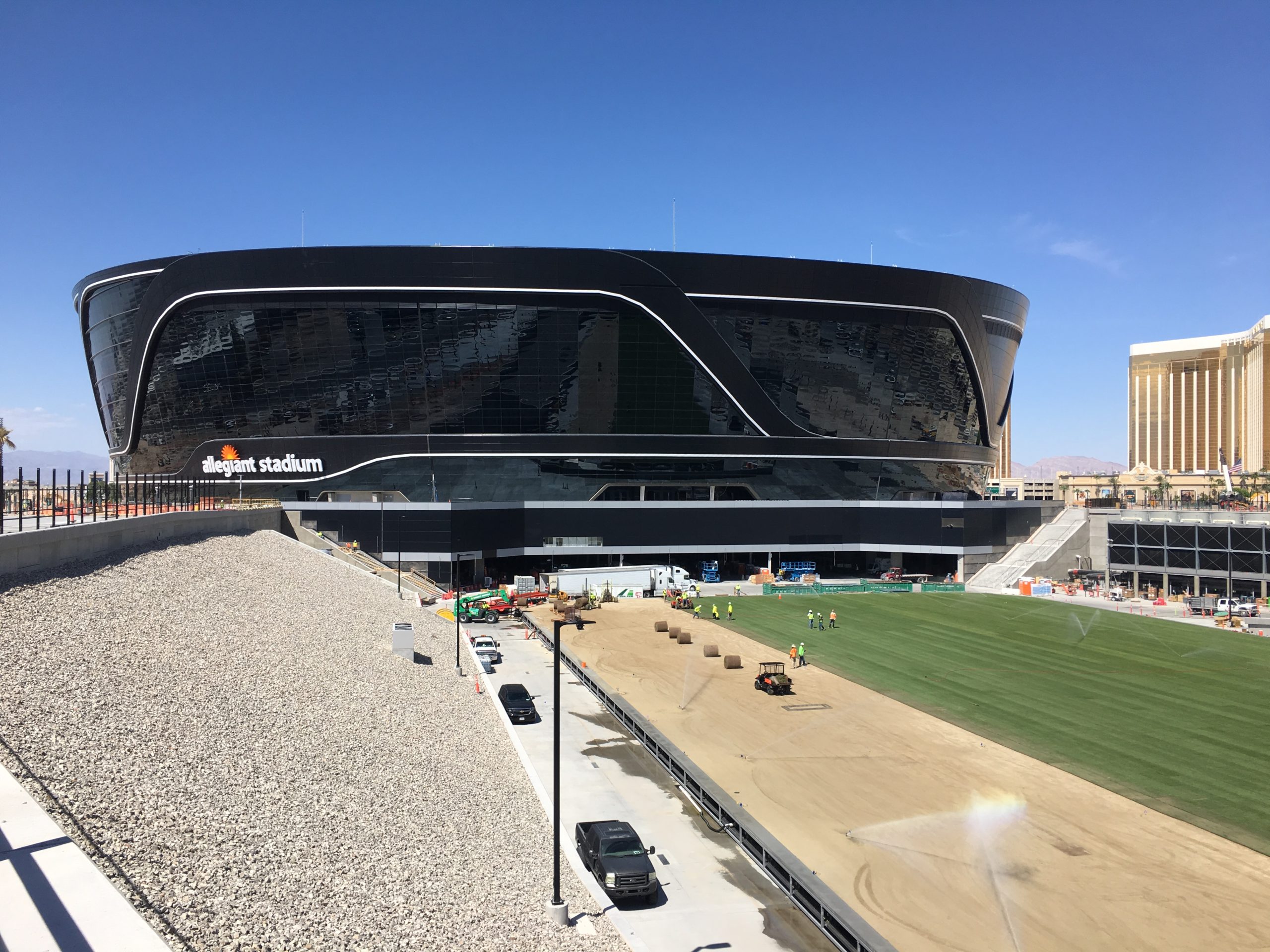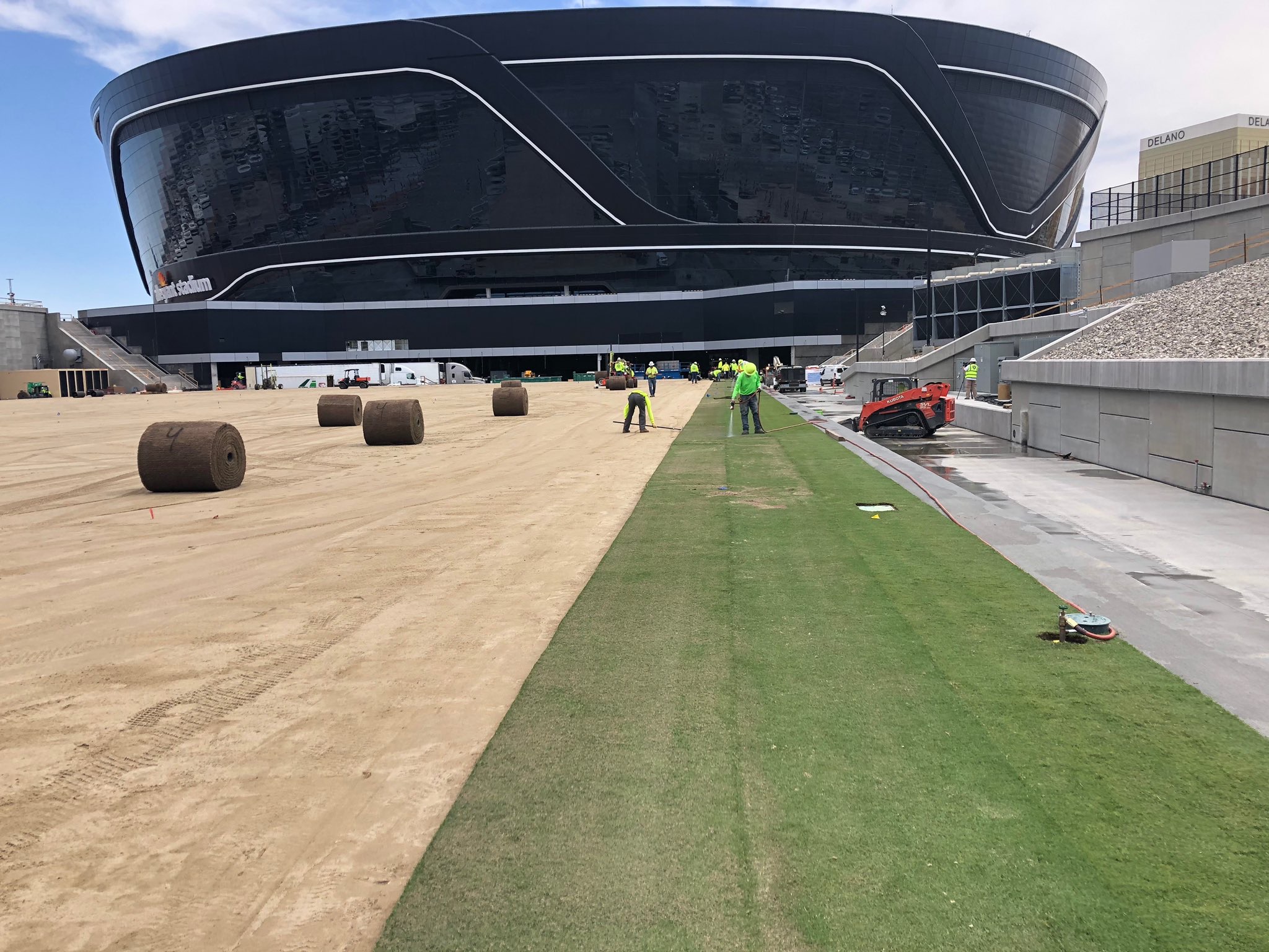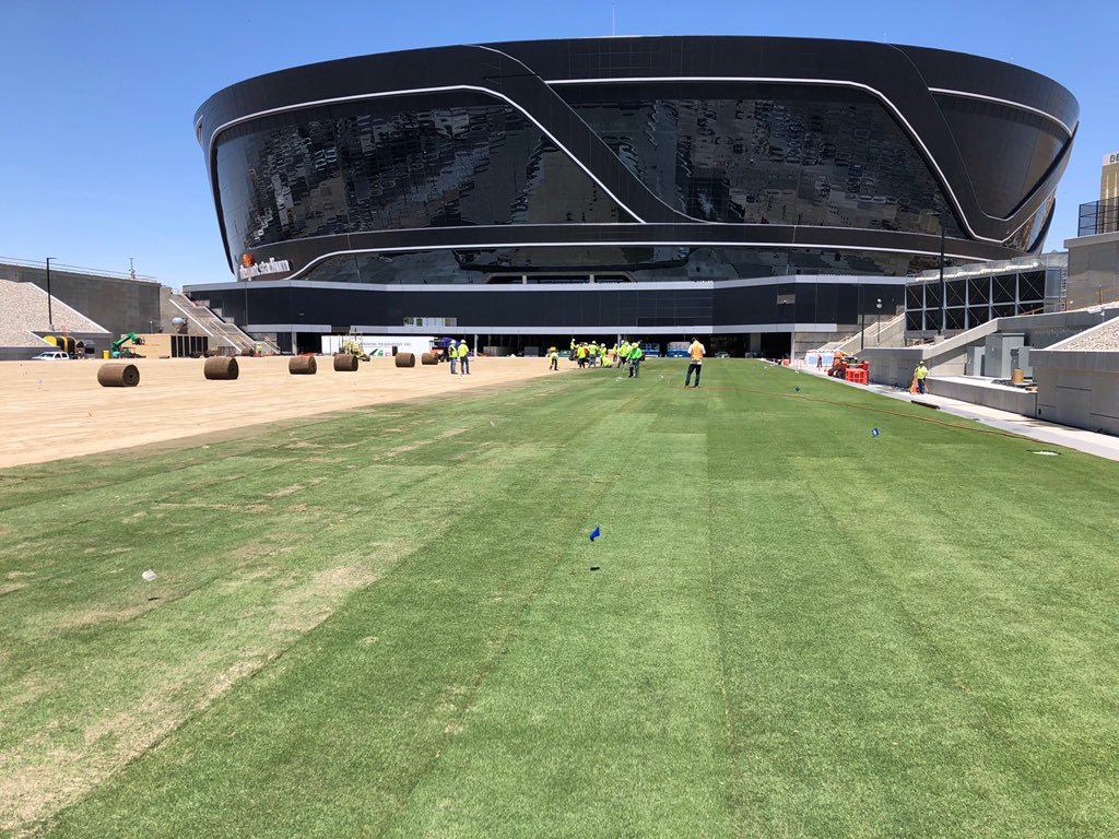 When you visit the Raiders’ Allegiant Stadium, you’re struck by the gleaming black exterior. But there is some green growing, too, at the stadium that will slide in a retractable tray holding the venue’s playing surface into the venue.