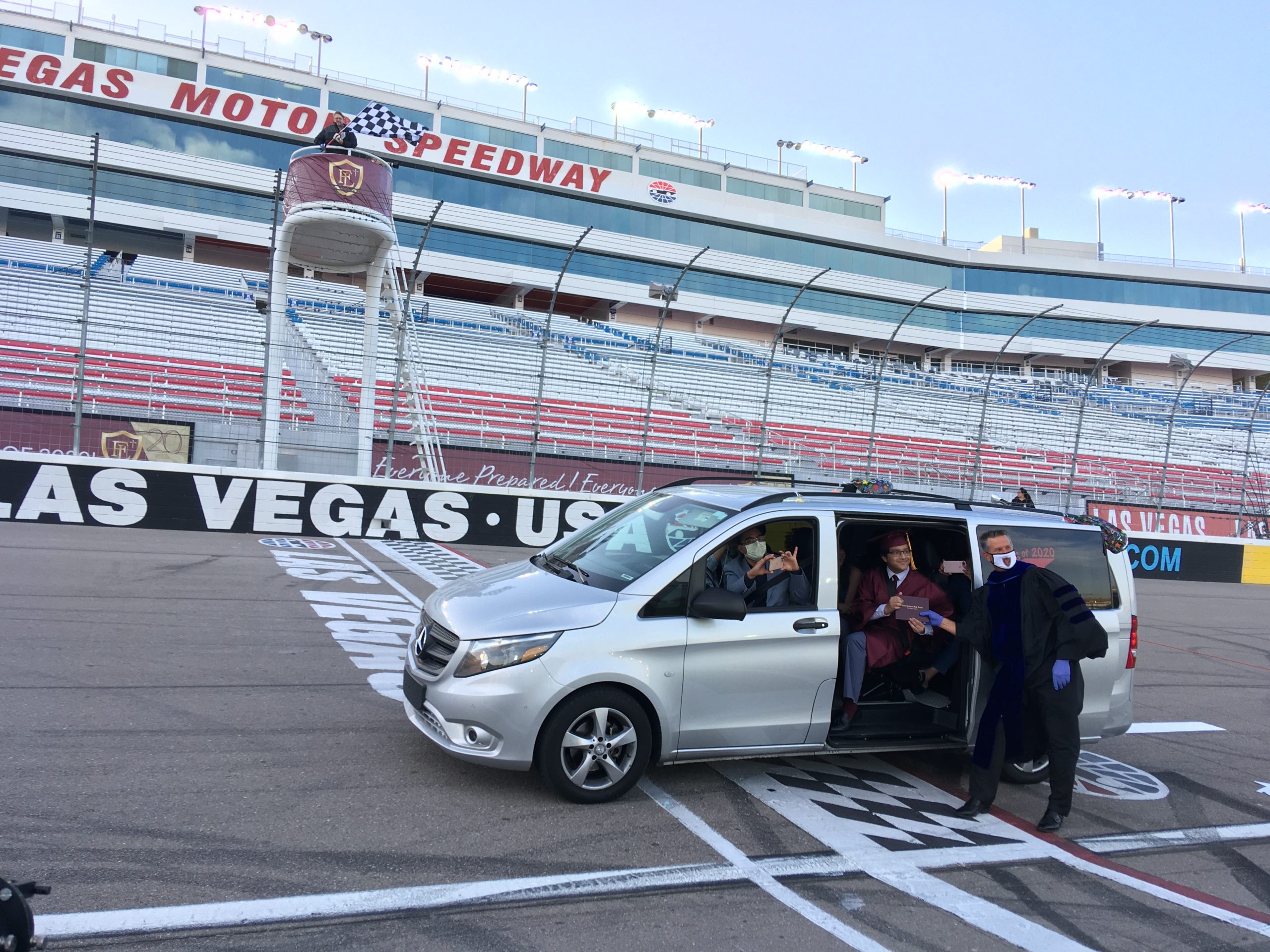 In this case, the Faith Lutheran event at the big Speedway north of Las Vegas was engineered by Dr. Steve Buuck, chief executive of Faith Lutheran Middle School & High School, who worked with Kevin Camper, Speedway Motorsports Inc chief sales officer, to make it happen. Camper, who oversees the sales and marketing at the Las Vegas NASCAR venue, also has a child who is a junior at Faith Lutheran. They worked with Mason VanHouweling, University Medical Center CEO who handled medical logistics, to pull together the graduation at the racetrack.