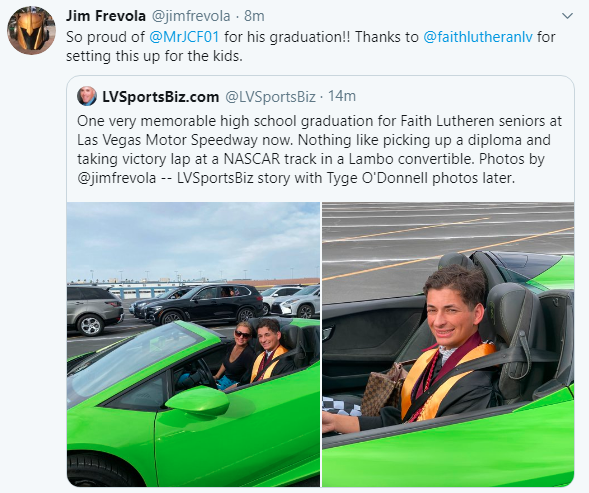 Jack Frevola will likely never forget many details from his Faith Lutheran High School graduation at Las Vegas Motor Speedway Friday evening.