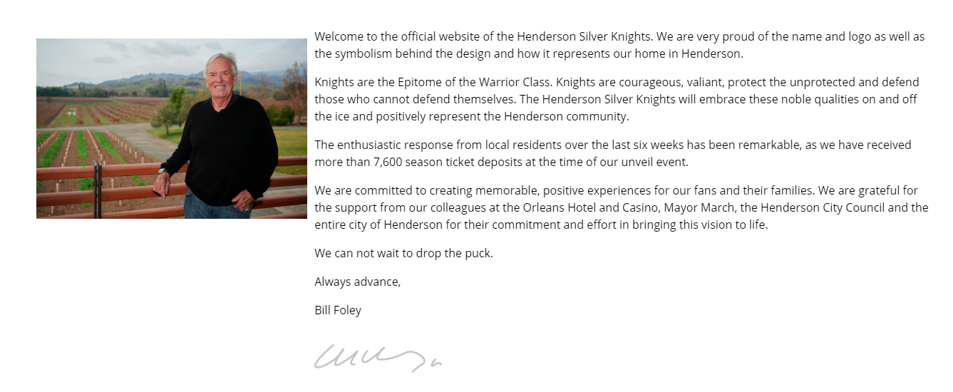 Here’s Foley discussing the new Henderson Silver Knights team, which will play first at the Orleans Arena while the the city of Henderson rebuilds its Henderson Pavilion into a 6,000-seat arena thanks to $42 million in public money approved by the Henderson City Council in a recent 4-1 vote. Foley looks like he’s at one of his wineries in this post on the Silver Knights’ new website.