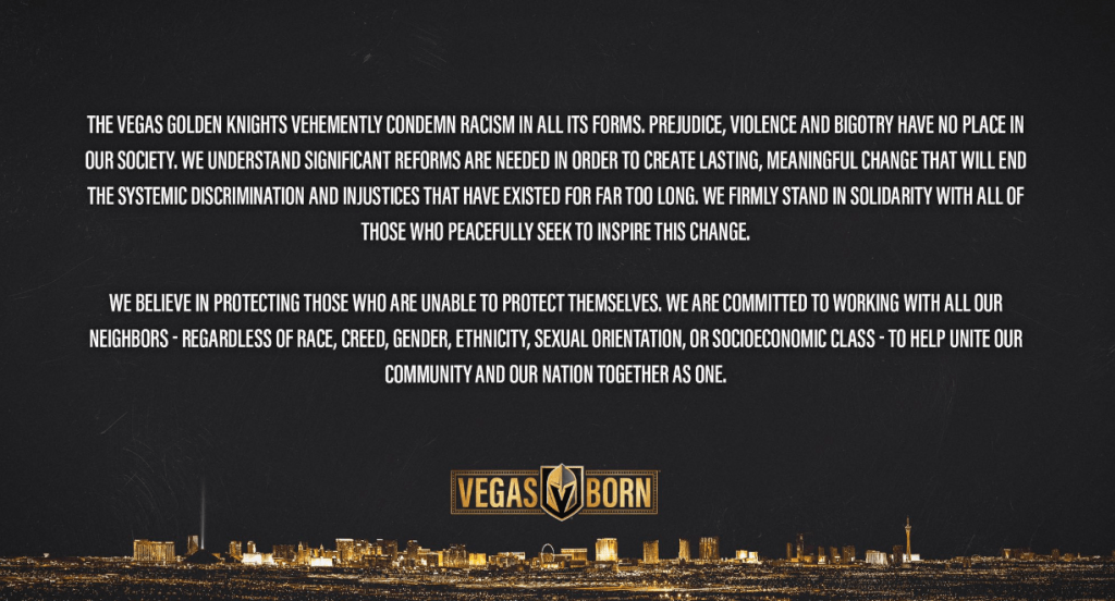 This Davis statement contrasts with the Vegas Golden Knights’ release, which makes no mention of Floyd. It talks in general terms of condemning racism and uniting the community, but does not refer to the names of black Americans who have been killed while in police custody.