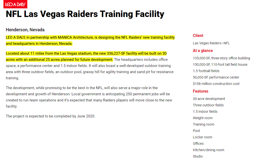Building designer Leo A Daly worked with Manica Architecture to create the 336,227-foot facility on 30 acres with another 25 acres open for development. The construction cost at the 55-acre site for the training center/HQ was $158 million. Here’s a summary of the Raiders facility and HQ from the Leo A Daly website: