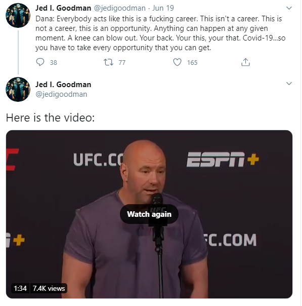 White compared it to his fighters preparing for fights by putting themselves in the most difficult physical positions during training. White said that’s what he’s doing in his business preparations in a daunting task to cope with the impact of a virus that spreads easily. Jed I Goodman’s Twitter post has White’s media talk on this topic.