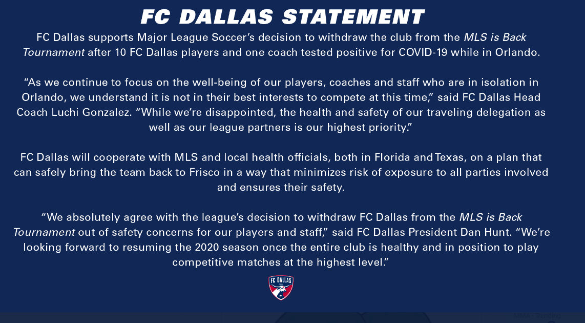 Meanwhile, the other sports leagues are forging ahead, too. Though there’s a sense of anxiety surrounding the re-starts of NBA, NHL and MLS. On Monday, the FC Dallas team in Major League Soccer dropped out of playing in the MLS Is Back Tournament in Orlando, Florida after a coach and 10 players tested positive for COVID-19 in Florida.